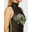 Body bez rukávů vyrobené z měkké strečové síťoviny, s rolákovým límcem. Přední strana je potištěna kapajícím logem Diesel v odstínu jasně zeleném.