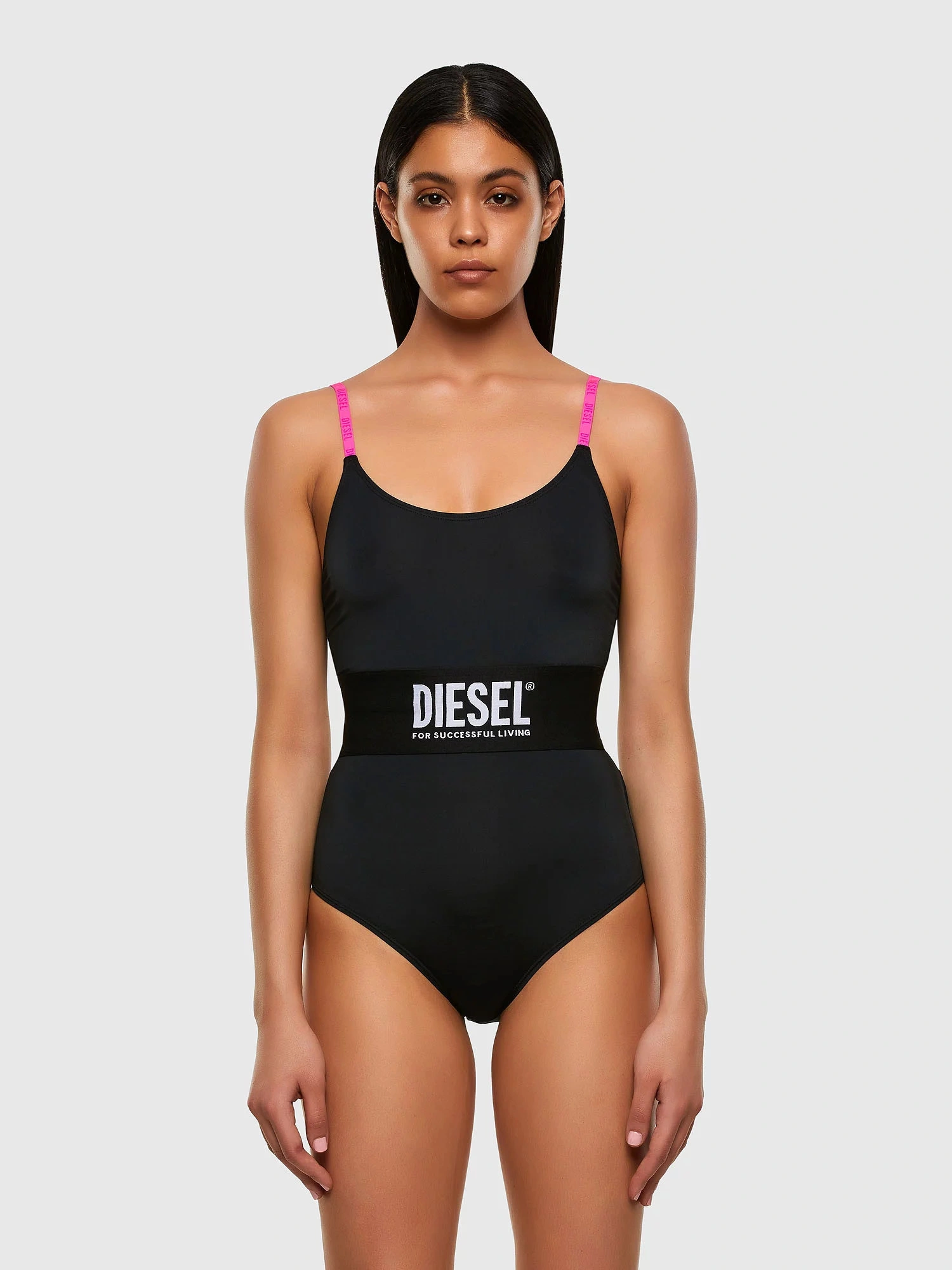 Třpytivé plavky s nízkým výstřihem vzadu a tenkými ramínky. S nápisem Diesel přes hrudník. Materiál