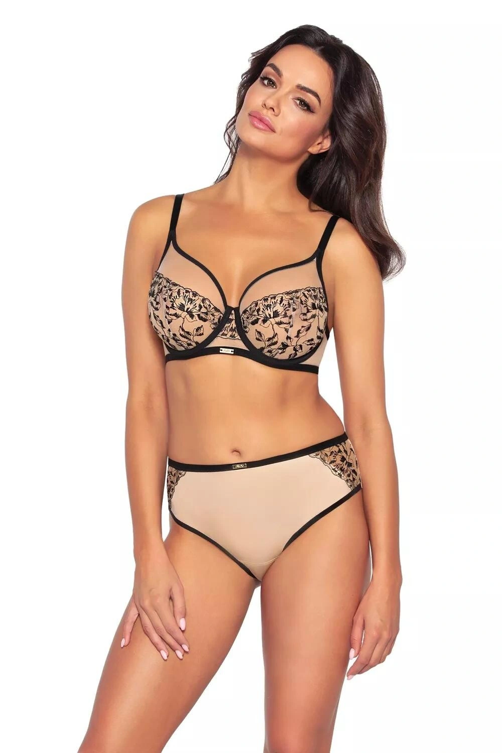 Dámské kalhotky 2061/b beige AVA- béžová barva- Brazilský typ- přední část z hladké tkaniny s jemným leskem- boky z vyšívaného tylu- zadní část z dvojité síťoviny, bez švůMateriál: 91% polyamid + 5% bavlna + 4% elastan