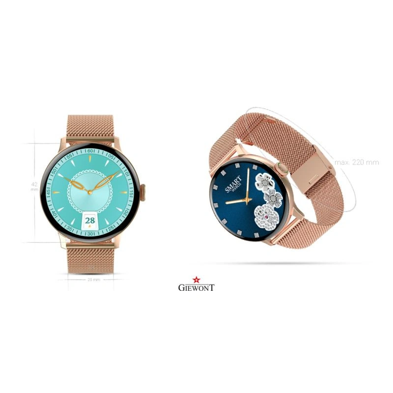 Smartwatch Damski GIEWONT GW330-1 to nowoczesny i stylowy dodatek, który doskonale łączy funkcjonalność z eleganckim, kobiecym designem. Został zaprojektowany tak, aby podkreślać indywidualny styl użytkowniczki, jednocześnie oferując praktyczne rozwiązania na każdy dzień. Smukła koperta i subtelne detale sprawiają, że zegarek prezentuje się wyjątkowo szykownie, a możliwość wymiany paska pozwala jeszcze lepiej dopasować go do stroju i okazji. Urządzenie oferuje szeroki zakres funkcji, które usprawniają codzienność. Można z niego rozmawiać, odczytu wiadomości i powiadomień z telefonu, przez kontrolę muzyki, aż po wygodne zdalne sterowanie aparatem. Wszystko to dostępne jest na wyraźnym, kolorowym ekranie, który zapewnia komfort obsługi niezależnie od warunków. GIEWONT GW330-1 wspiera również dbanie o zdrowie i dobre samopoczucie. Monitoruje tętno w czasie rzeczywistym, analizuje jakość snu oraz zlicza kroki i spalone kalorie, dzięki czemu możesz na bieżąco śledz