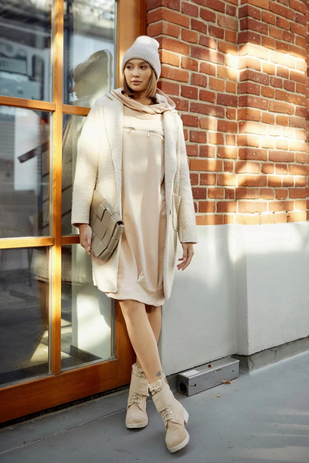 Bomber šaty s volným střihem vám umožní cítit se pohodlně v mnoha každodenních outfitech. Teplákové šaty s dlouhými rukávy, kapucí a ozdobnými zipy a záševky.