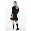 Romantické šaty ze vzdušné tenké pletené mikiny. Velmi příjemné nošení. Doporučujeme zejména pro rovné siluety. Šaty mají mírně nařasené rukávy zakončené stuhou a kulatý výstřih. Proto z něj budou nadšené zejména dámy s malými prsy. V přední části šatů je našita jemná ozdobná aplikace. Spodní část šatů je zakončena lehkým volánkem. Šaty nezakrývají tělo, jsou velmi pohodlné, takže v nich můžete pohodlně strávit celý den.