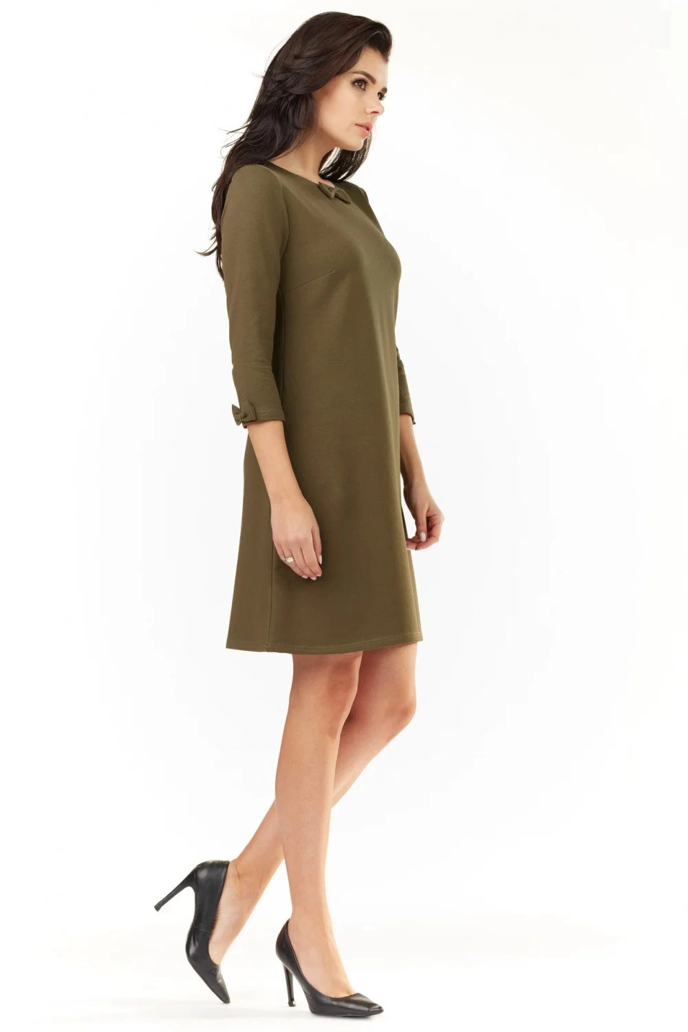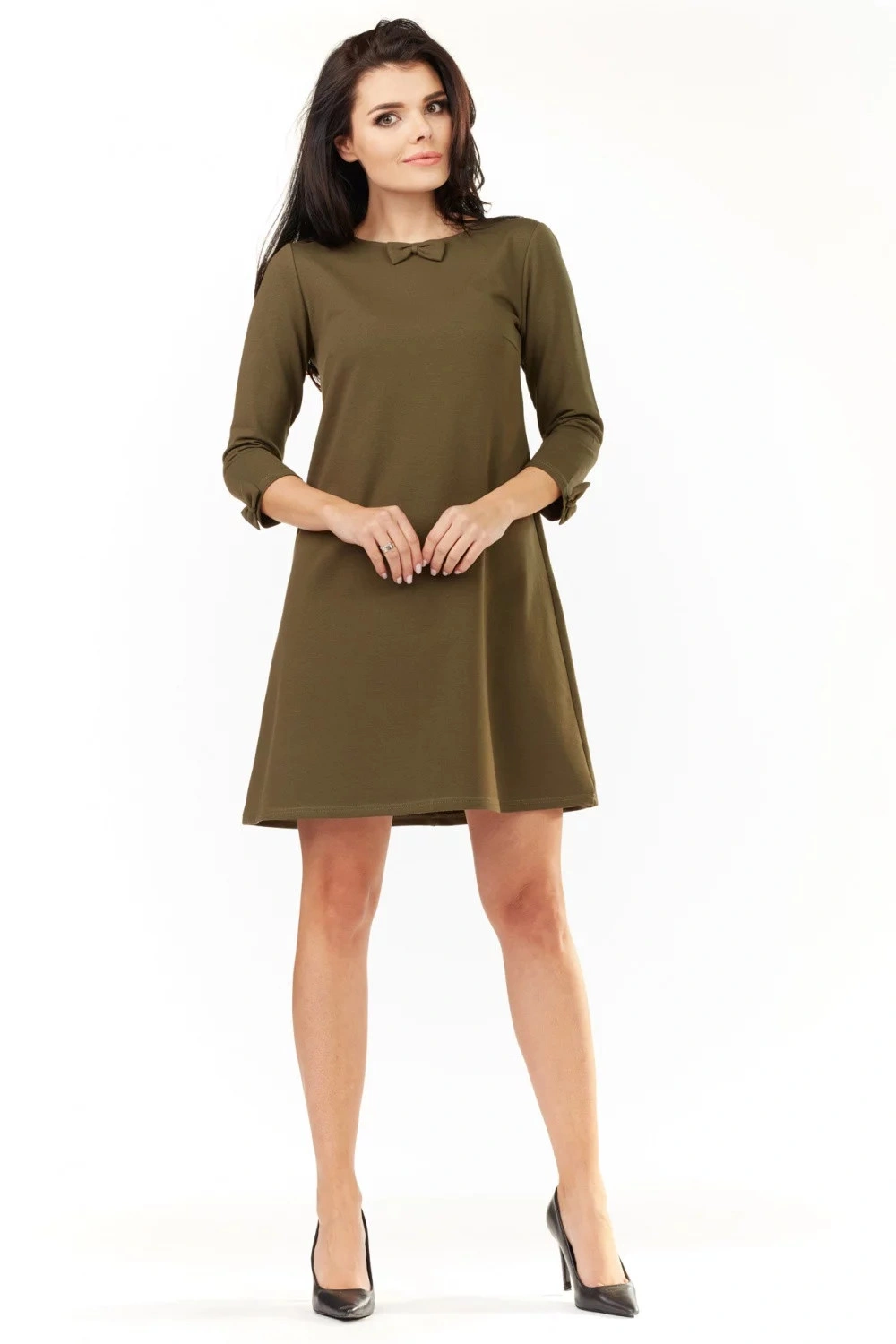 Skvělé šaty s 3/4 rukávy, mírně rozšířené. Zdobí je mašle na rukávech a ve výstřihu.