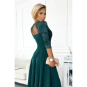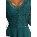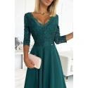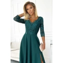 Pěkně vytvarovaný výstřih a vysoký rozparek ve spodní části šatů vytváří neobyčejnou kreaci v lahvově zelené barvě. Tyto šaty značky Numoco jsou polským výrobkem.