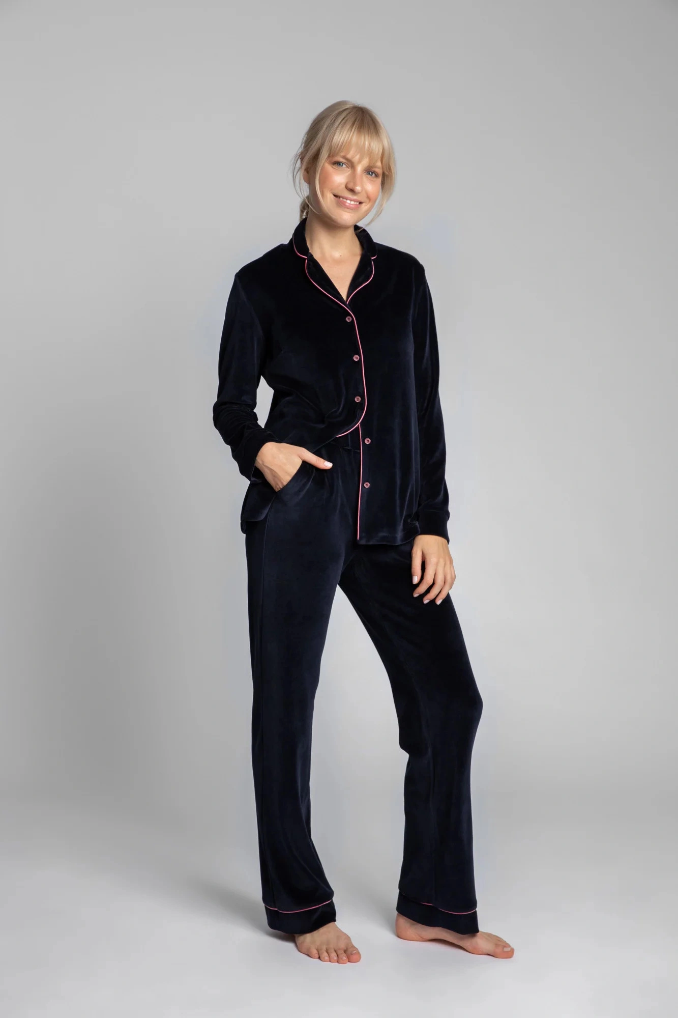 Spěte, ale stylově v těchto sametových kalhotách s manžetami a ozdobným lemováním, které mají siluetu inspirovanou pánskou módou. Vytvořte si soupravu s naší sametovou pyžamovou košilí s ozdobným lemováním.
