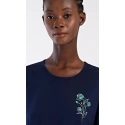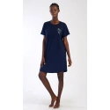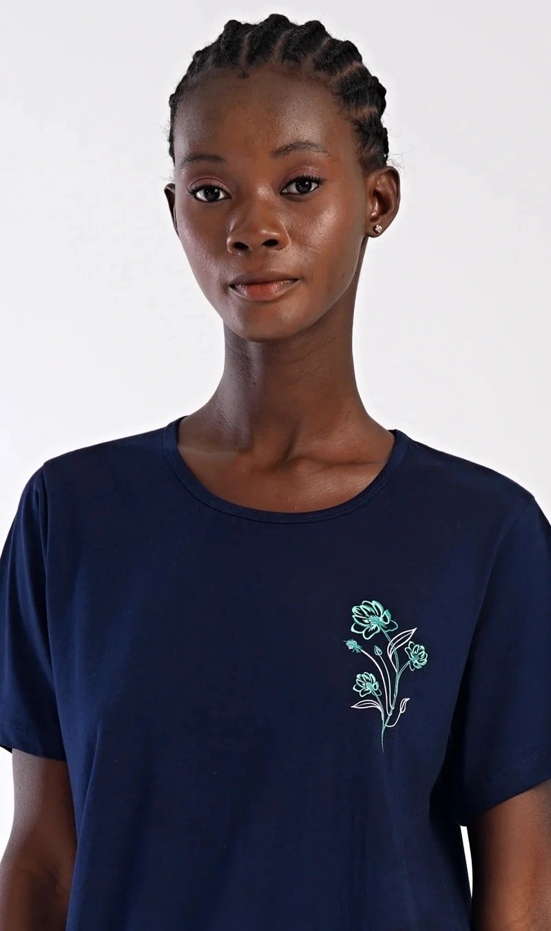 Dámské bavlněné domácí šaty s krátkým rukávem Zuzka. Domácí jednobarevné šaty s kulatým výstřihem a kapsami zdobí na hrudi obrázek květů.