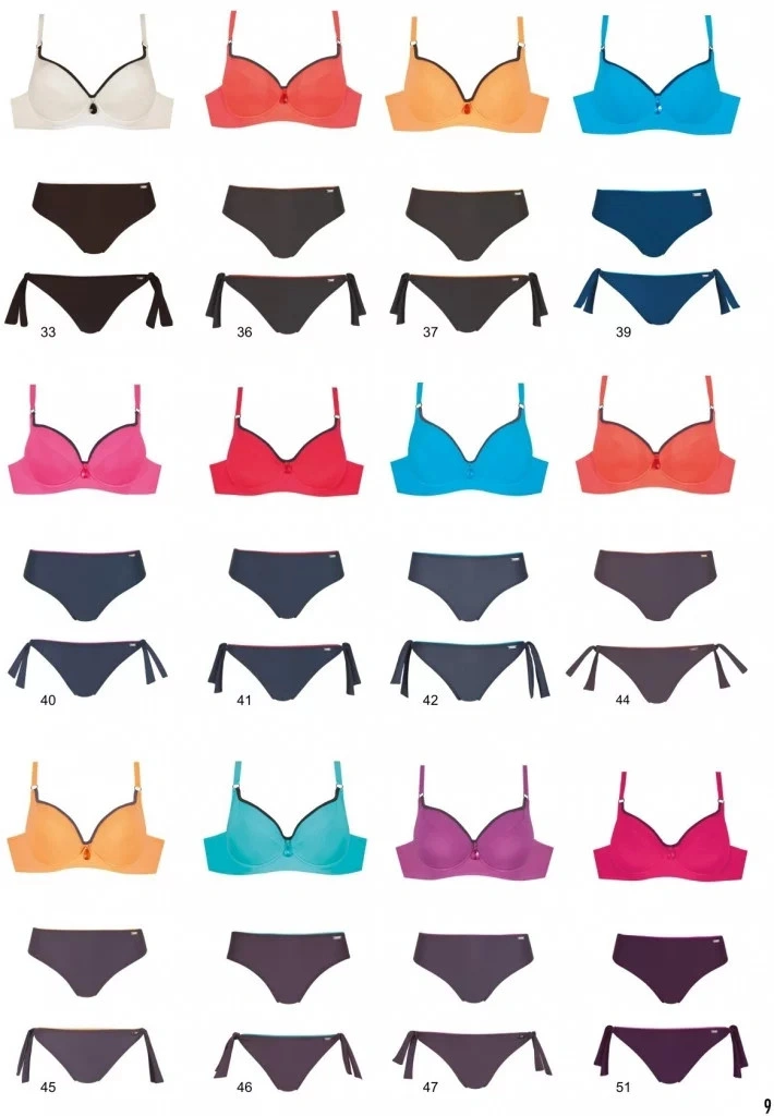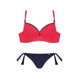 Dvoudílné plavky s košíčky s měkkou pěnovou výztuží a kosticemi. Ramínka jsou regulovatelná. Kalhotky nízkého střihu jsou na bocích na vázání. Jedná se o jinou barvu podprsenky a jinou barvu kalhotek v kompletu.