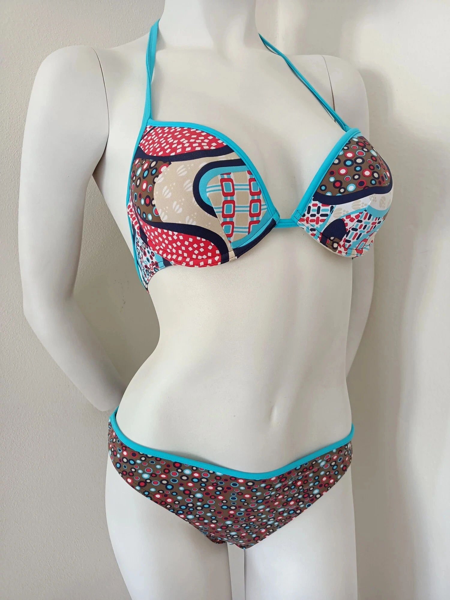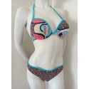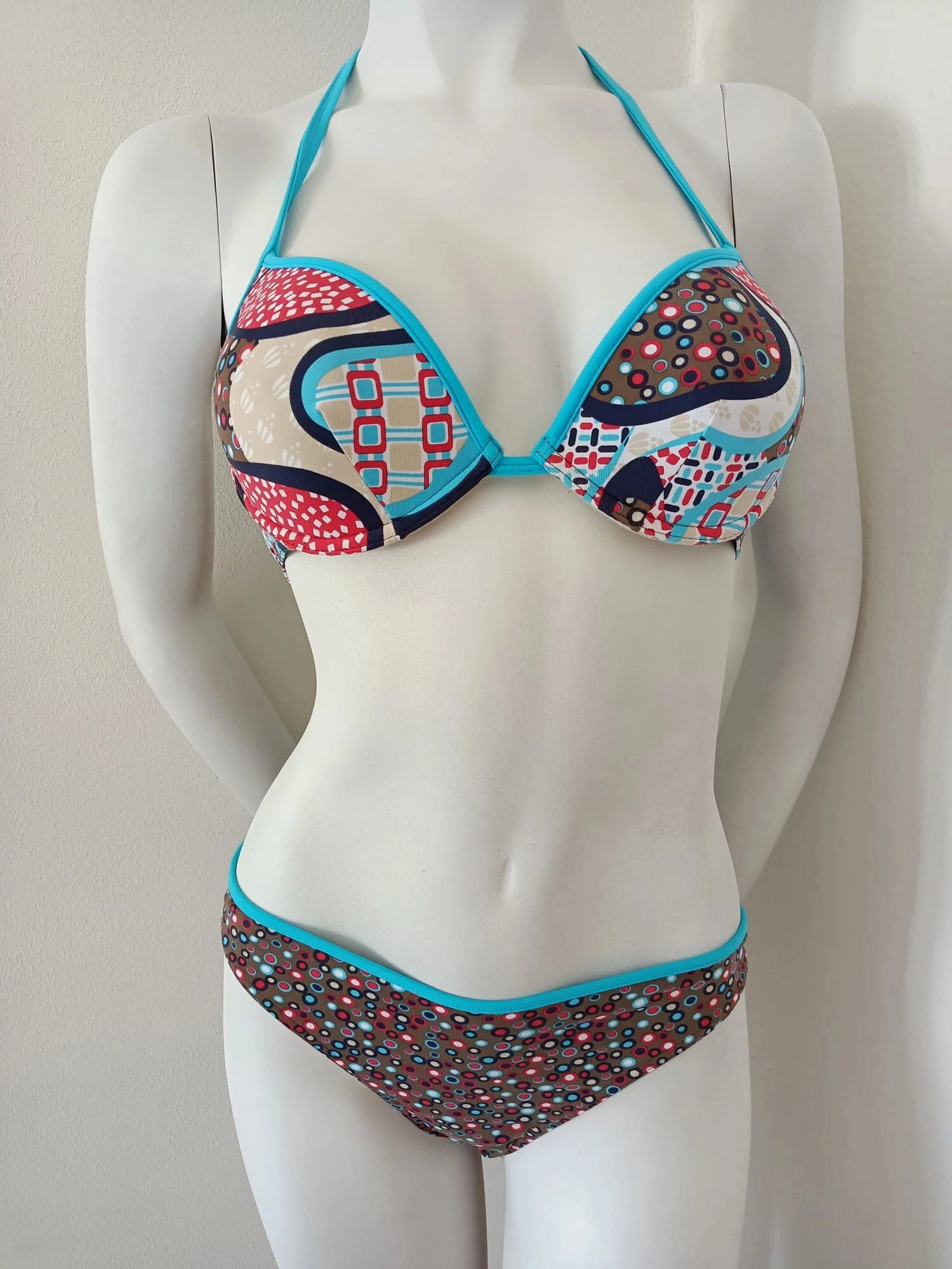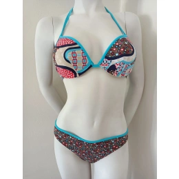 Dvoudílné dámské plavky. Vrchní díl vyztužená, s kosticemi. Zavazování za krkem a na zádech.