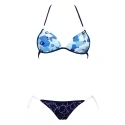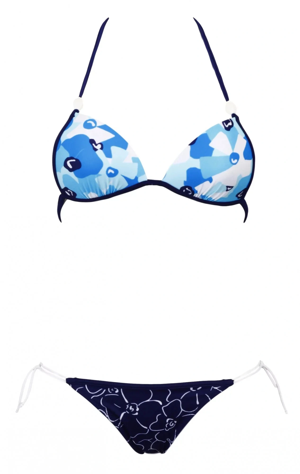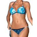 Sexy bikiny s květinovým vzorem. Vyztužená podprsenka se zavazuje za krkem a na zádech. Ramínka zdobí bílé korálky. Košíčky zdobí efektní řasení. Kalhotky se zavazují na bocích, které opticky prodlouží nohy. Zadní strana jednobarevná. Plavky jsou ušité z velmi kvalitní, italské látky. Vhodné na opalování i plavání.