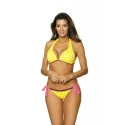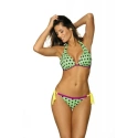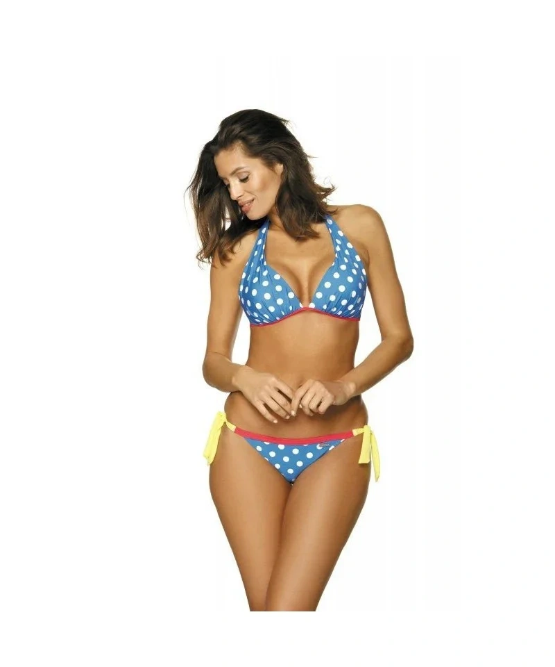 Podprsenka modelu se zavazuje za krkem, má vytvarované košíčky a vzadu pohodlné zapínání na klip. Model má svislé kostice. Vykrojené kalhotky se na bocích zavazují. Plavky zdobí vzor kontrastních puntíků.