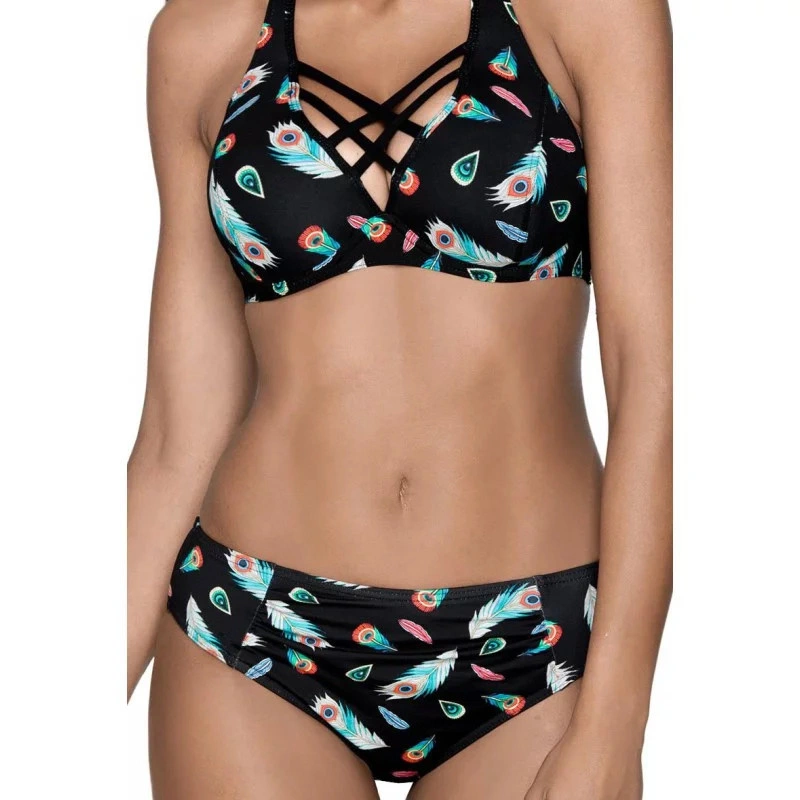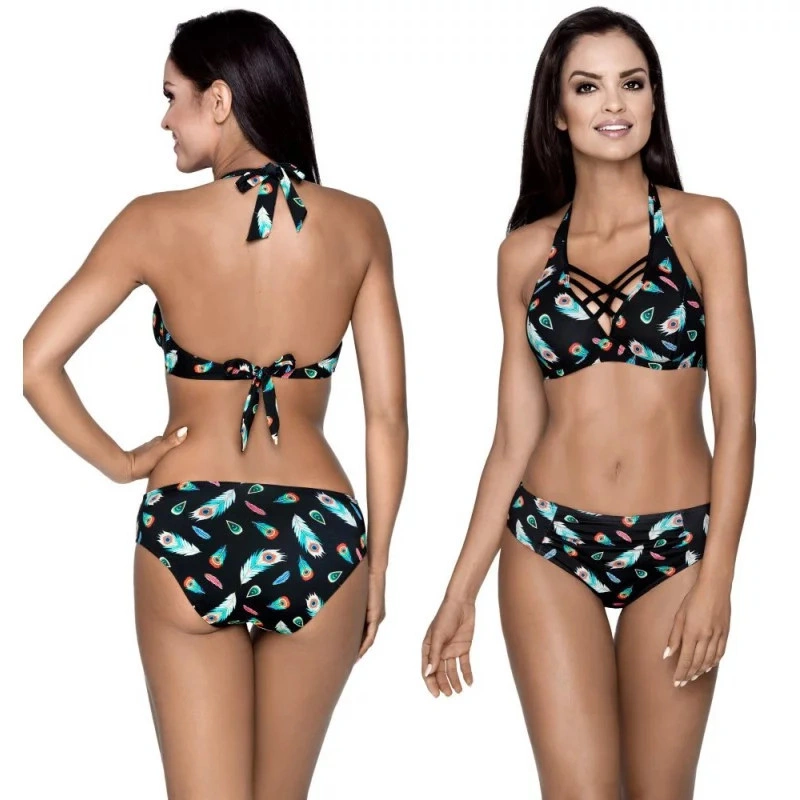 Dámské bikiny pro letní dny, kombinace klasické černé s barevným vzorem.
