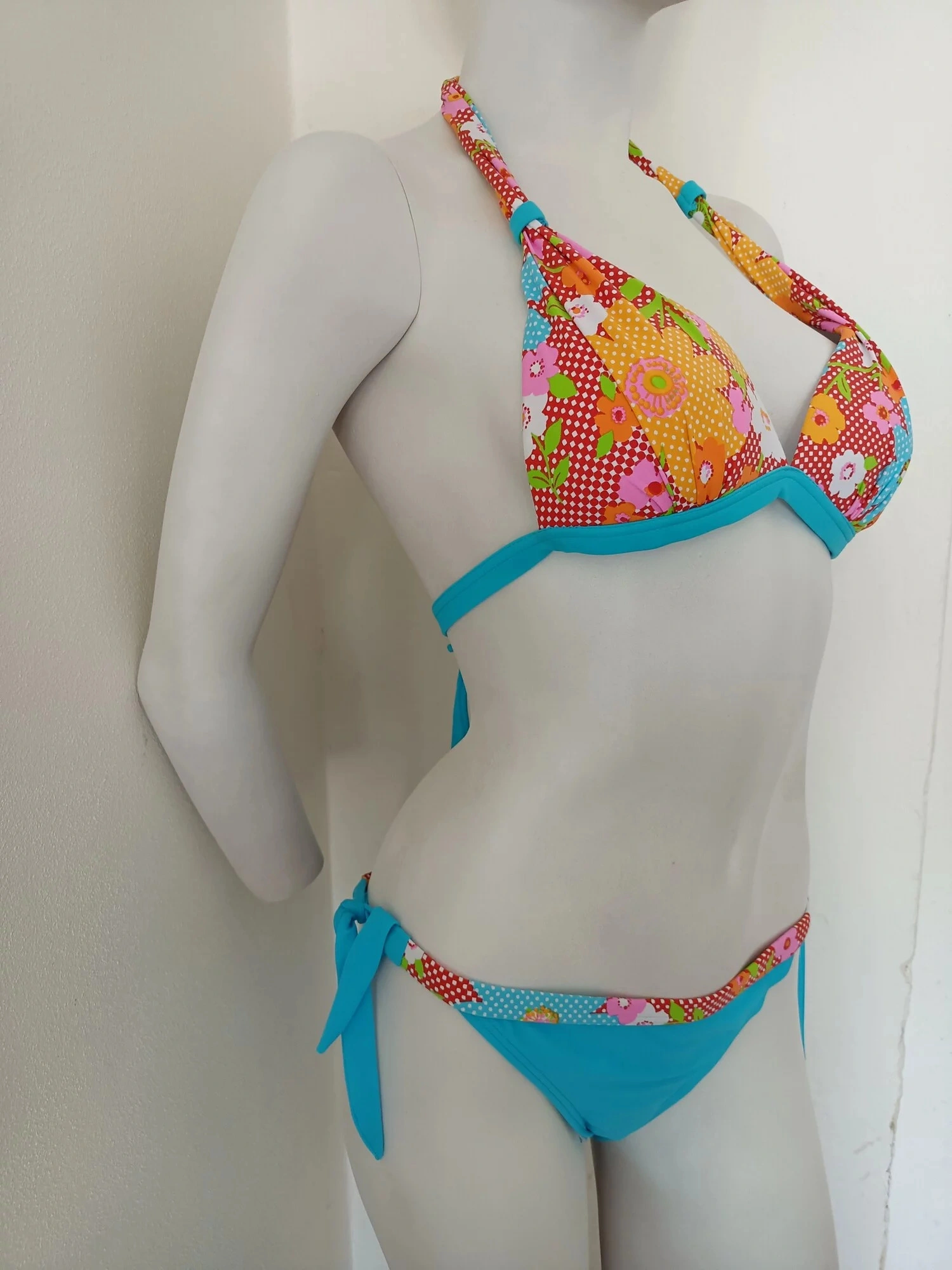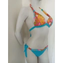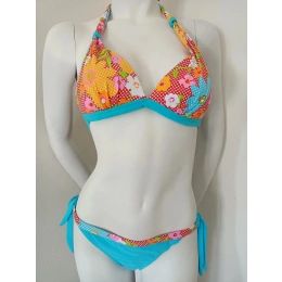 Dámské dvoudílné plavky. Trojúhelníkové vyztužené košíčky, bez kostic. Zavazování za krkem a na zádech.