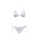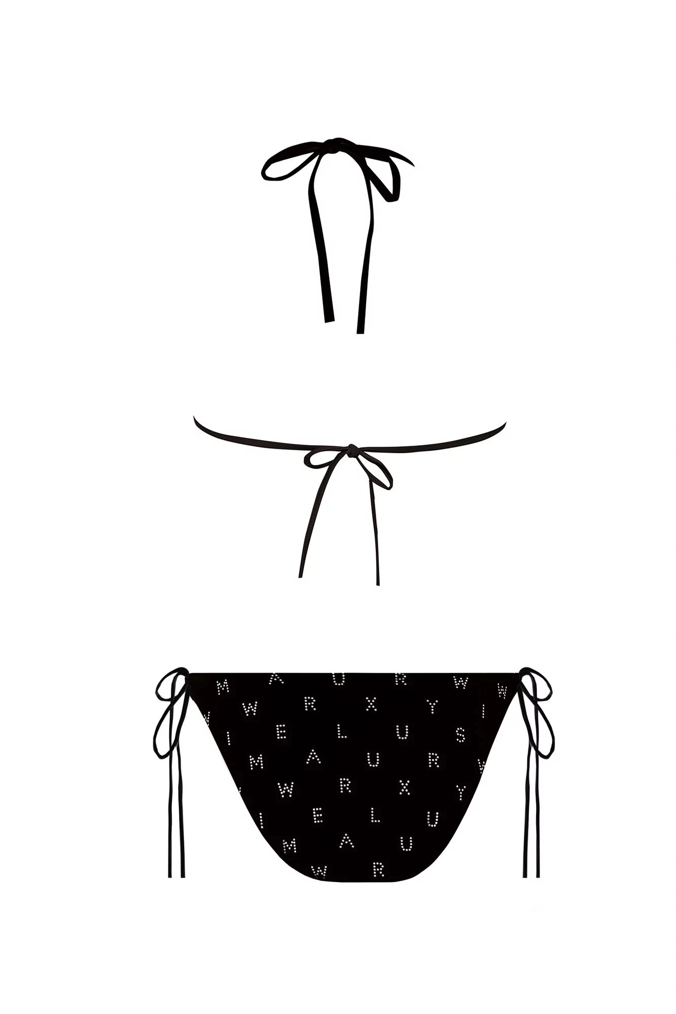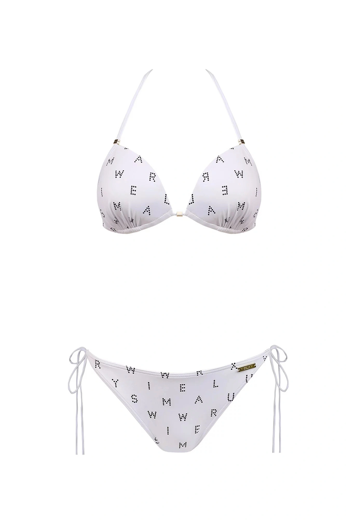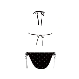 Dámské dvoudílné plavky, bez kostice, jemně vyztužené, spodní část vrchního dílu na posouvání. Vzadu zavazování za krkem a na zádech. Spodní díl na zavazování na bocích.