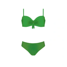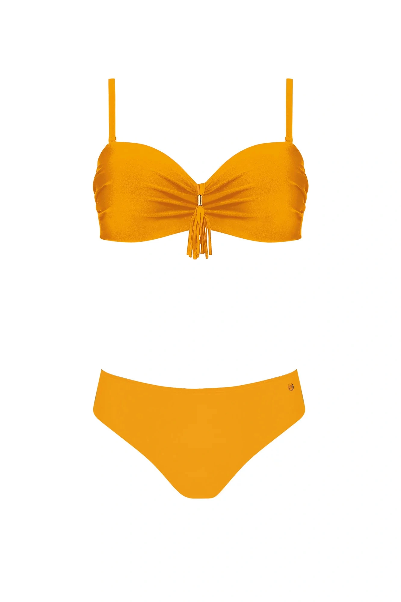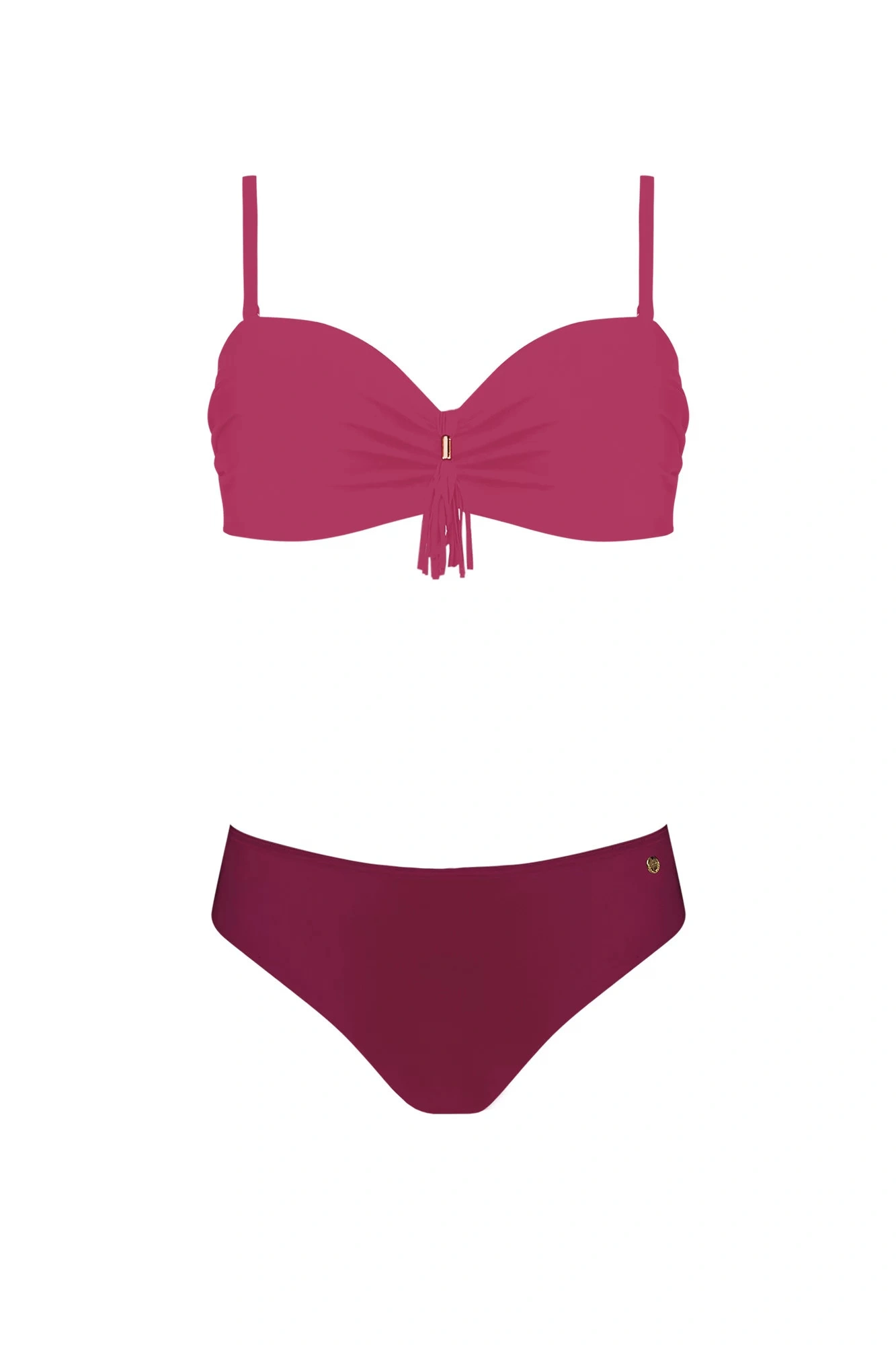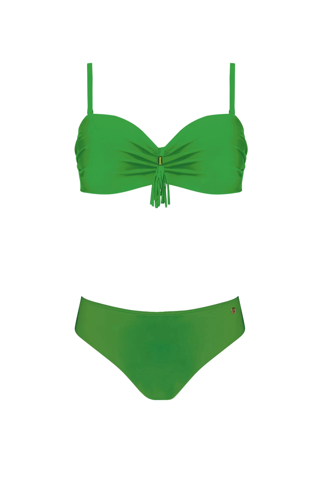 Dámské dvoudílné plavky Monako 5, vrchní díl vyztužený, s kosticí, nabíraný, balkonového střihu. Mezi prsy ozdobný strapec. Ramínka jsou odepínací, na posouvání. Spodní díl klasického střihu.