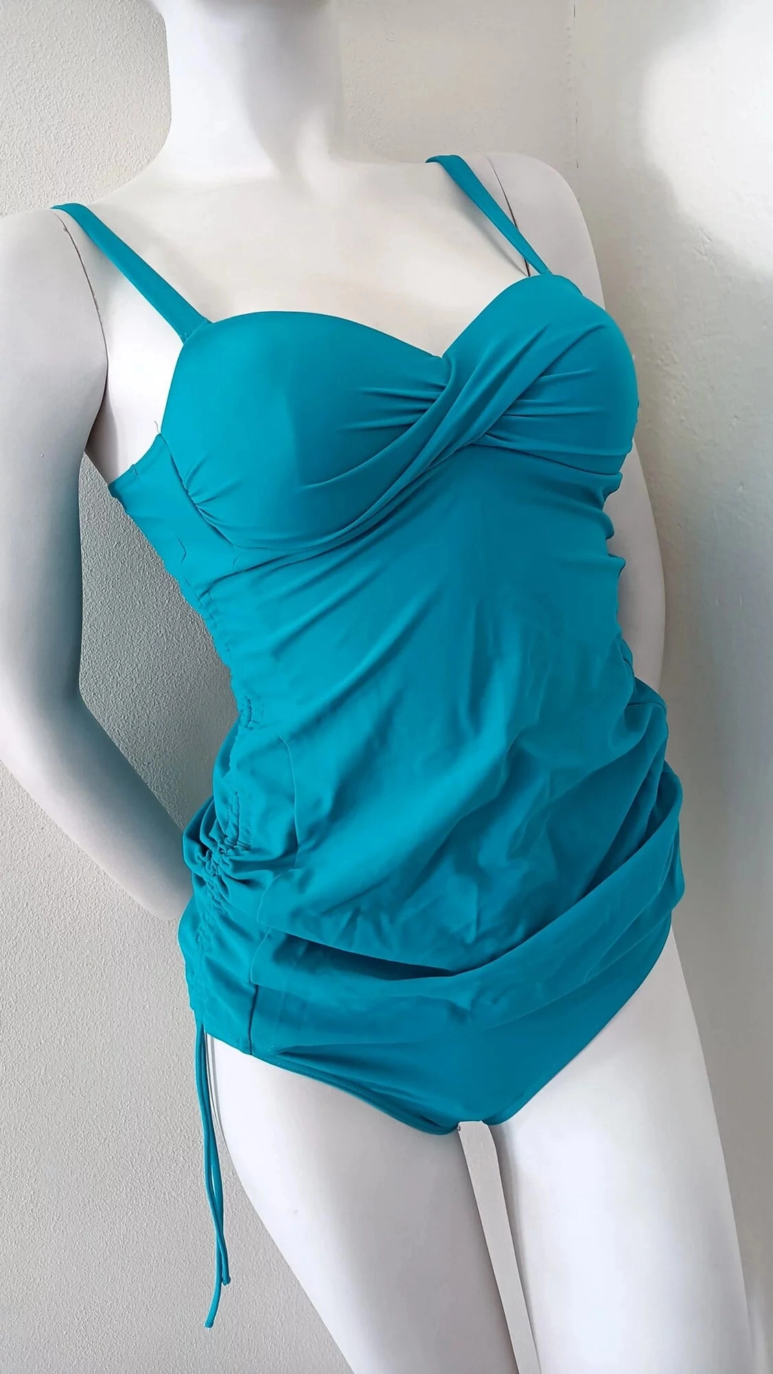 Módní plavky RAISA I Gwinner. Plavky velice lichotivého ženském střihu zvýrazňují dekolt. Vrchní díl, který je možno na bocích nařasit a tím zkrátit, je ušit ve stylu topu - tzv. Tankiny. Košíčky jsou vyztuženy bez kostic. Ramínka jsou délkově nastavitelná. Kalhotky jsou jednoduchého klasického střihu. Tyto plavky jsou vhodné pro ženy, které rády nosí jednodílné plavky, ale zároveň dávají přednost originalitě.