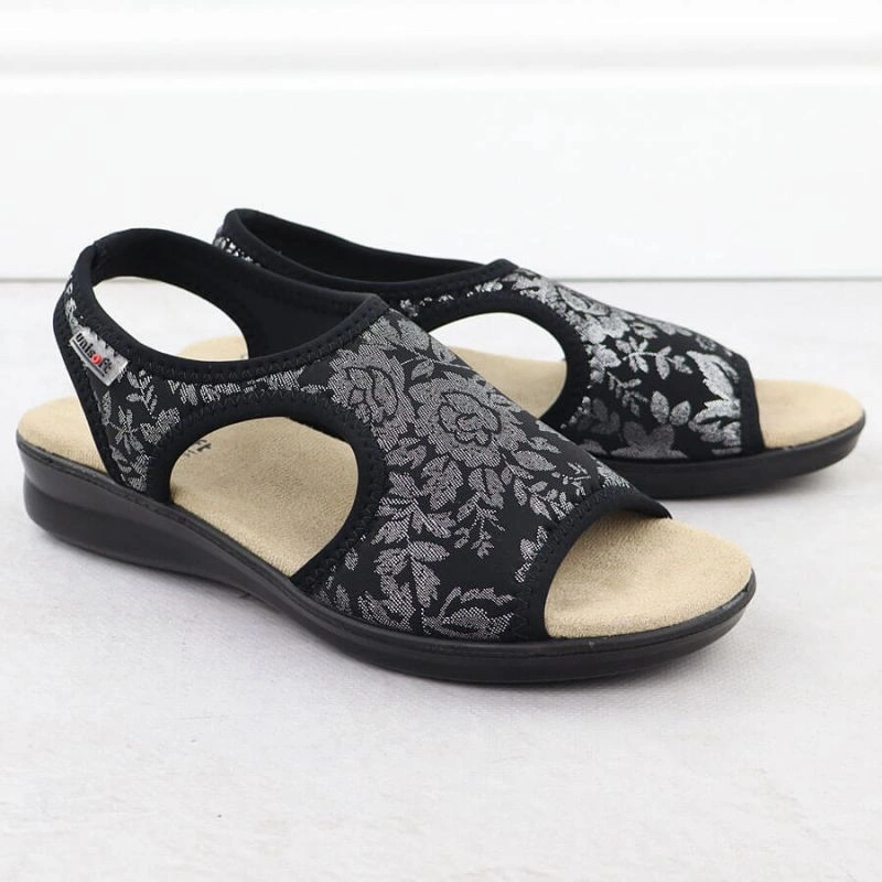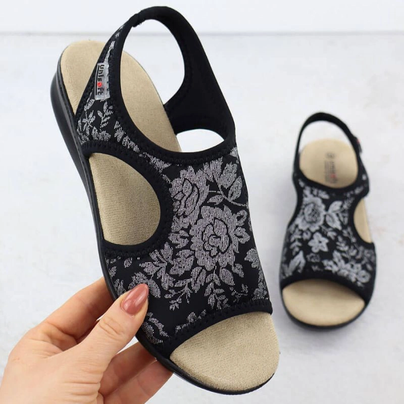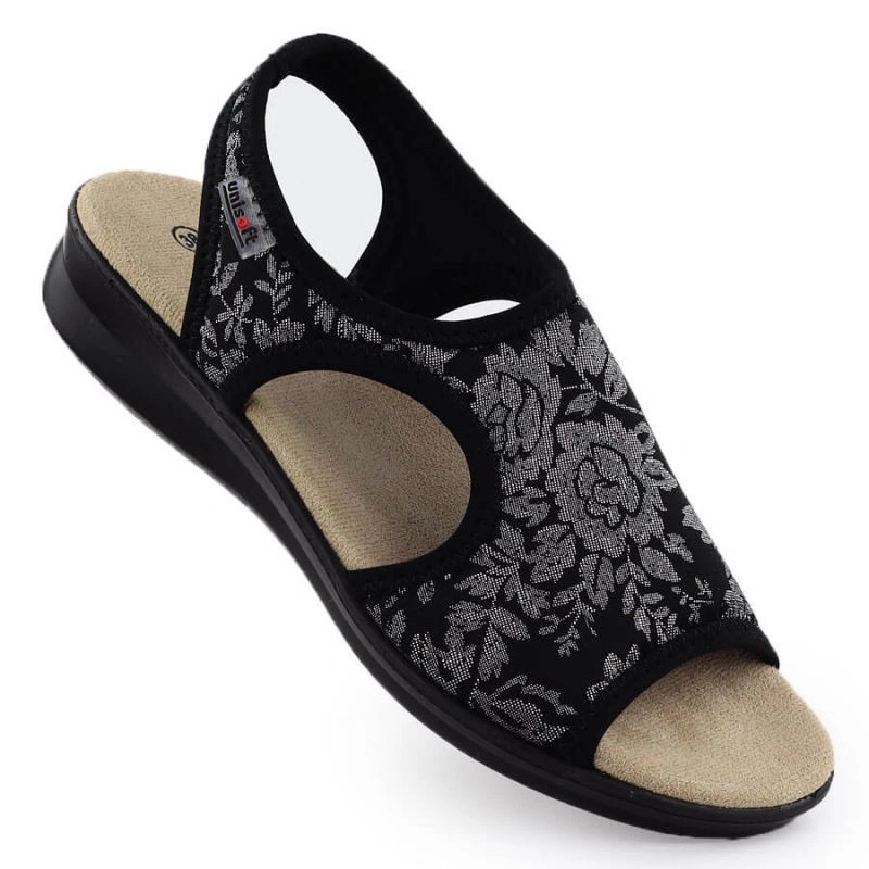 Popis Dámské elastické květinové sandály s vysokým sedem černé Unisoft 7196