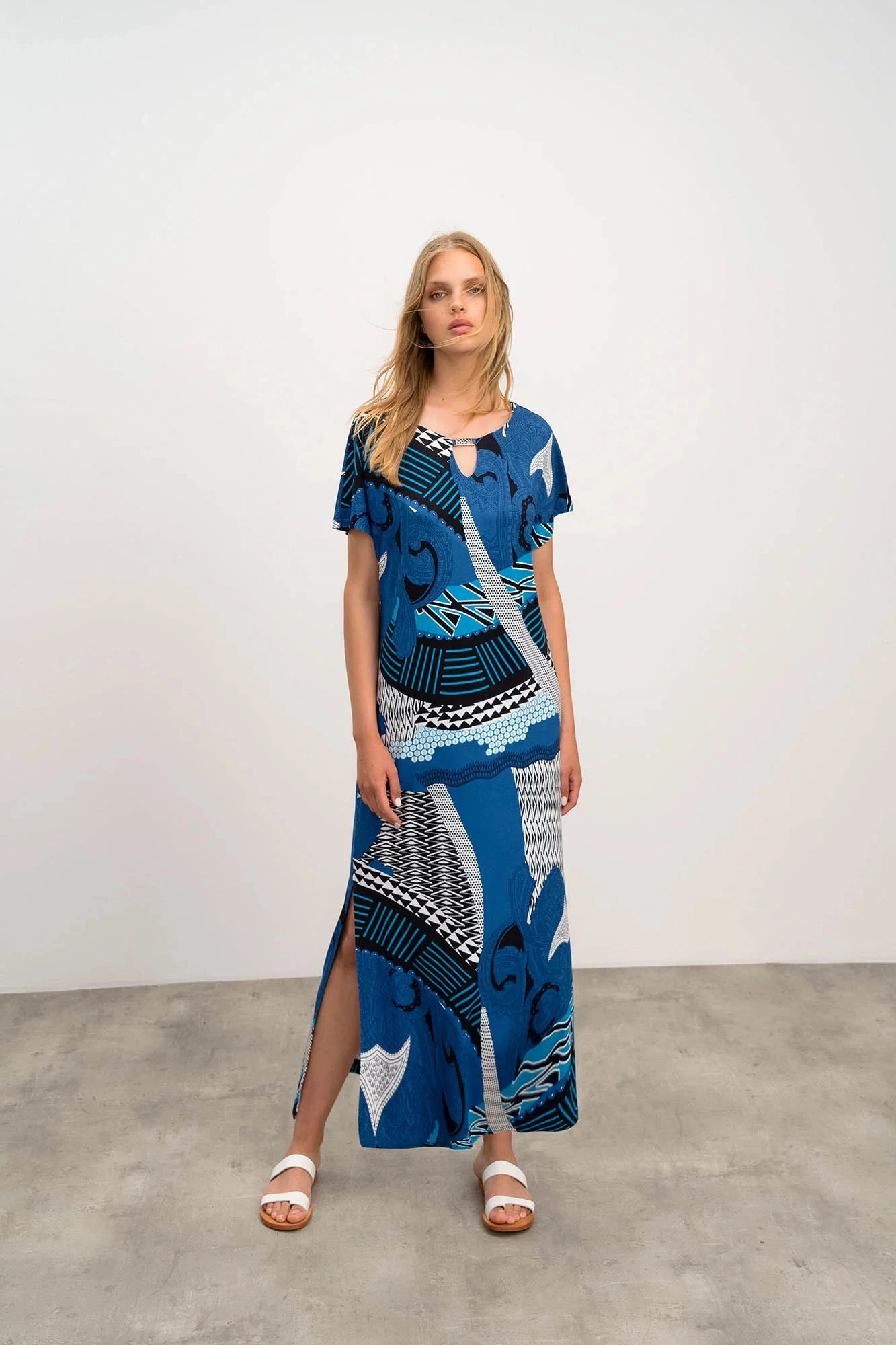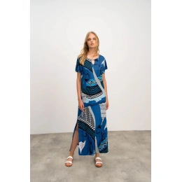 Elegantní dlouhé vzorované dámské šaty s krátkýnm rukávem, kulatým výstřihem a ozdobnou sponou, vše co žena v parných letních dnech potřebuje. Šaty jsou vyrobené z kvalitní jersey viskózy s příměsí elastanu. Jersey Viscoza se vyznačuje vysokou savostí, je dobře prodyšná, měkká a příjemná na dotek a elastan zaručuje lepší pružnost tkaniny.