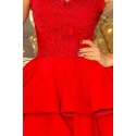 Nádherné dámské šaty vhodné pro společenské události. Model šatů je bez rukávů s výstřihem do V, který nádherně zvýrazní dekolt. Horní část šatů je zdobená jemnou krajkou a přidá tak šatům romantičnost. Pozornost také zajistí bohatá dvojitá sukénka. Délka šatů je nad kolena. Pokud se chystáte na společenskou událost, kde chcete být za princeznu, je tento model jasným favoritem. Oblečte si je na společenské události, jako jsou plesy, svatby či formální oslavy a budete středem pozornosti.