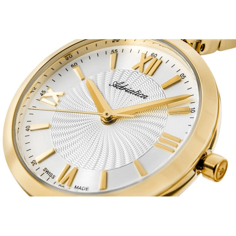 Přesné ručičky, zlaté indexy s římskými číslicemi a ciferník, který jemně odráží světlo - to vše dohromady vytváří kompozici, od které je těžké odtrhnout oči. Kvalitní materiály, hodinářské detaily a dokonale zakomponované barvy - hodinky Adriatica se nosí jako šperk a každý pohled na vaše zápěstí se stává estetickým zážitkem. Vzhled dotváří název Adriatica na ciferníku a decentní logo na zapínání náramku a na korunce.