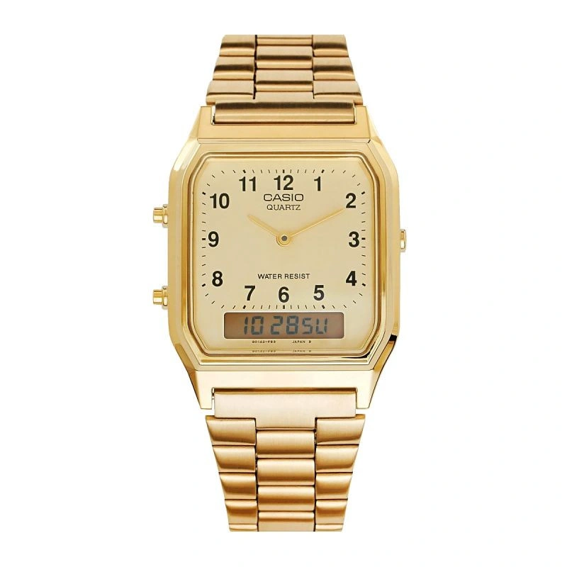 Hodinky Casio AQ-230 v sobě spojují prestiž, funkčnost a nadčasovou estetiku. Hodinky Casio AQ-230 jsou ideální volbou pro ty, kteří oceňují vintage styl, ale nechtějí se vzdát moderních řešení, a to nejen díky krásnému designu, ale také vynikající přesnosti chodu. Duální analogově-digitální displej umožňuje kontrolovat čas ve dvou zónách současně a další funkce, jako je budík, stopky a automatický kalendář, zvyšují jejich praktičnost.