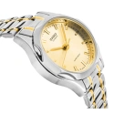 Jemný ciferník v barvě šampaňského zlata je kvintesencí elegance a nadčasového stylu. jemná saténová povrchová úprava nádherně odráží světlo a dodává mu luxusní a zároveň decentní charakter. štíhlé, vypouklé zlaté indexy harmonicky splývají s celkem a precizně zpracované ručičky kloužou po ciferníku s mimořádnou lehkostí a zajišťují vynikající čitelnost. postříbřené pouzdro s jemně zaoblenými hranami dodává hodinkám lehkost a eleganci a dokonale splývá s klasickým stylem hodinek. to vše vytváří ucelenou, elegantní kompozici, v níž byl každý detail dotažen k dokonalosti.