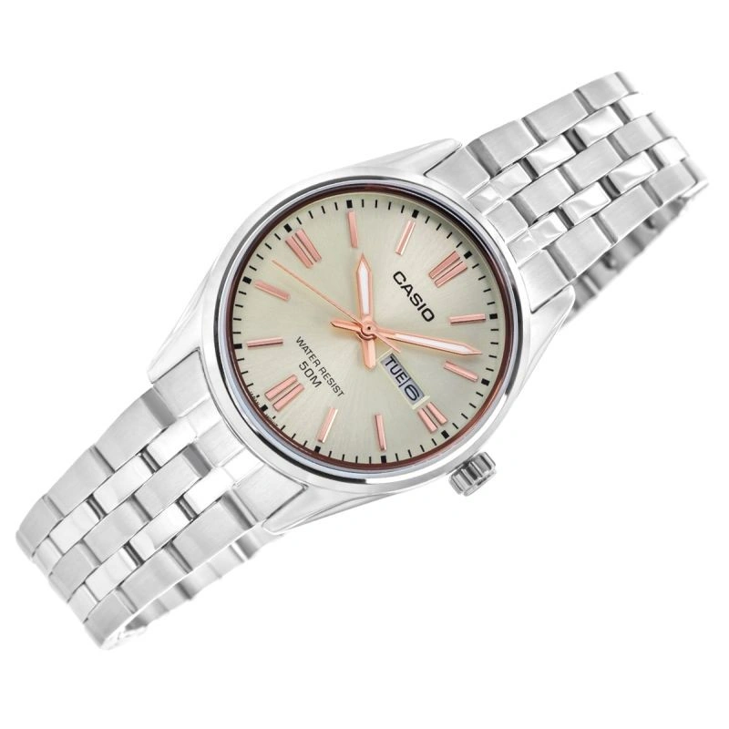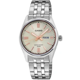 Damski zegarek CASIO LTP-1335D to harmonijne połączenie subtelności i nowoczesnej elegancji. Tarczamaciepły, złocisto-szampański odcień. To kolor subtelny, z klasą, o lekko satynowym połysku. Kojarzy się z elegancją i delikatnym luksusem – pasuje do ciepłych tonacji skóry, złotej biżuterii i stylizacji w odcieniach beżu, écru czy karmelu. Dyskretna funkcja datownika z dniem tygodnia troszczy się o Twoją codzienność, a wodoodporność do 50 (5 BAR) metrów sprawia, że możesz mieć go zawsze przy sobie – niezależnie od planów i pogody. To zegarek dla kobiety, która ceni jakość, lekkość i świadome wybory. Delikatny, ale pełen charakteru. Elegancki, ale nienachalny. Będzie doskonałym dopełnieniem białej koszuli, zwiewnej sukienki i ulubionych jeansów z wysokim stanem – bo to Ty nadajesz ton swojemu stylowi.