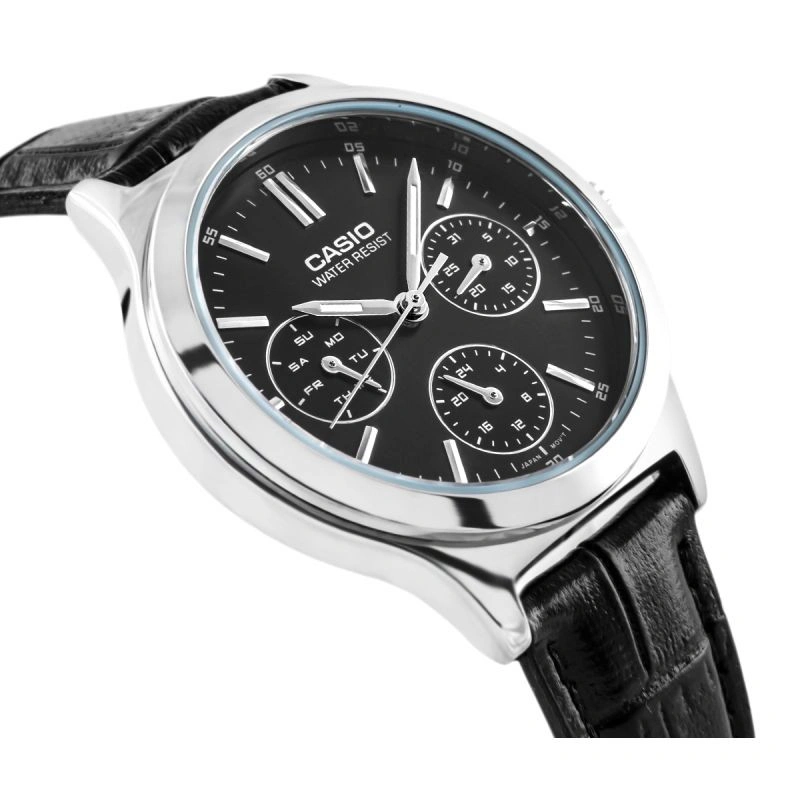 Tyto hodinky CASIO představují eleganci v té nejčistší podobě - klasická černá v kontrastu s lesklou ocelí vytváří nadčasové duo, které se hodí ke každé ženské stylizaci. Ciferník s jemným matným povrchem a štíhlými indexy vyzařuje minimalismus a sofistikovanost. Tři subtilní dílčí ciferníky ukazují den v týdnu, datum a čas ve 24hodinovém formátu, což mu dodává nejen šarm, ale také praktičnost. Kožený řemínek s krokodýlí texturou dodává elegantní nádech a jemně obepíná zápěstí. Jedná se o ideální volbu pro ženy, které milují klasiku s nádechem moderny a oceňují funkčnost ukrytou v krásné formě.