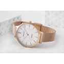 Tyto hodinky jsou opravdovou pastvou pro oči, neboť kombinují půvab růžového zlata s jemností bílého ciferníku. Růžově zlatý obal jemně obepíná sněhově bílý ciferník a vytváří nepřehlédnutelný efekt elegance. Indexy z růžového zlata, zdobené třpytivými zirkony, mu dodávají zářivost, podobně jako paprsky ranního slunce, zatímco ručičky a vteřinová ručička z růžového zlata se plynule pohybují po ciferníku a přinášejí harmonii a sofistikovanost.