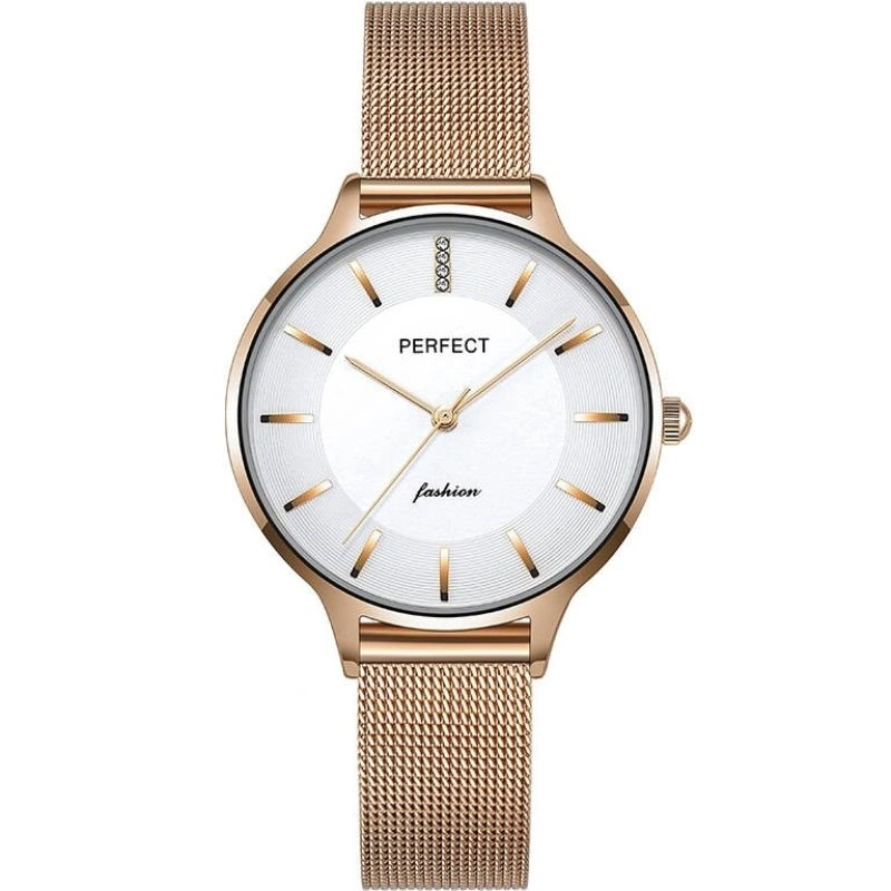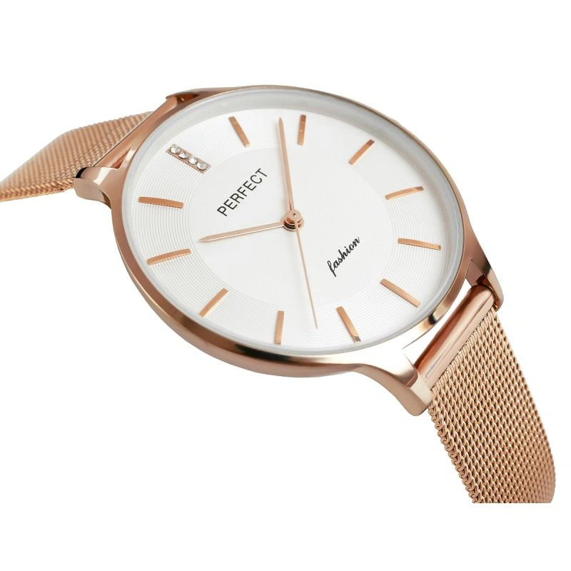 Je vyroben z vysoce kvalitní oceli a dokonale padne na ženské zápěstí pro pohodlné celodenní nošení. Jeho elegantní konstrukce a spona zdobená logem značky Perfect dodávají hodinkám jedinečný styl a odlišují je od ostatních.