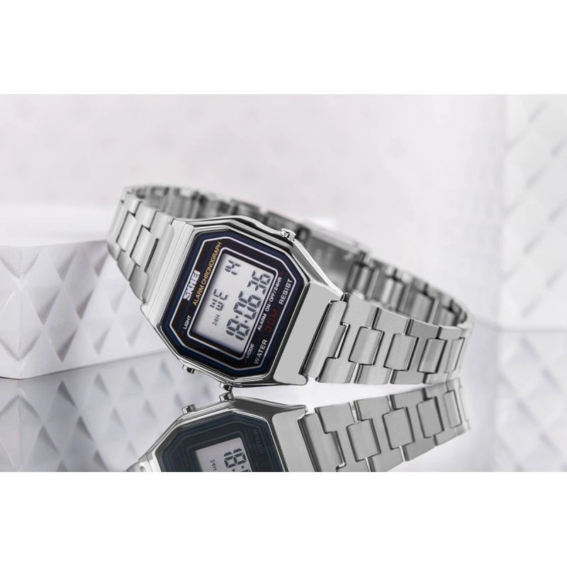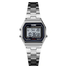 Tento model je malým mistrovským dílem klasiky, které na zápěstí vypadá jako elegantní stříbrný náramek s nádechem vintage. Jeho chladné kovové zbarvení ve stříbrné barvě upoutá pozornost stejně jako měsíční svit a dodá každému vzhledu jemný, sofistikovaný šarm. Obdélníkové pouzdro s digitálním displejem v tmavém kontrastním odstínu dodává hodinkám charakter - tyto hodinky jsou dokonalou kombinací retro stylu a modernosti. Model navíc nabízí praktické funkce, jako je budík, stopky a digitální displej, které usnadňují plánování a sledování času každý den, takže se budou dokonale hodit pro dynamický rytmus vašeho života.