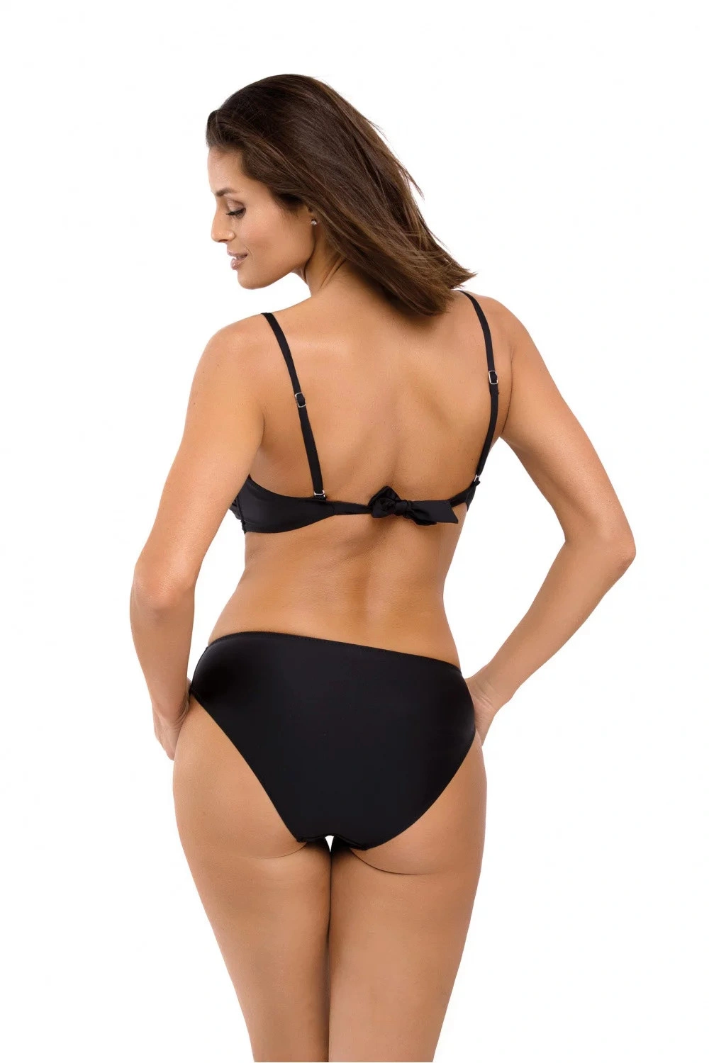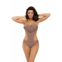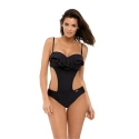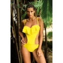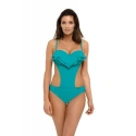 Hladké, jednodílné dámské plavky - monokiny bez ozdob, které však perfektně napodobuje nejnovější trendy, aktuálně kubánský plážový styl. Vrchní část plavek skrývá vyztužené košíčky s kosticemi, které jsou vyztuženy speciální pěnou se zabudovanou vycpávkou push-up. Díky vycpávkám mohou být ňadra přizvednuta více nahoru a do středu dekoltu, zároveň vypadají opticky větší. Smyslný volán dekolt zvýrazní. Ramínka mají možnost celkového odepnutí. Obvod se zavazuje na zádech. Na bocích jsou atraktivní výstřihy. Spodní díl je komfortní, na bříšku vyniká pruh látky maskující drobné nedostatky v jeho oblasti. Kalhotky zakryjí celý zadeček a elegantně se mu přizpůsobí. Italská vysoce kvalitní látka Carvico Tesutti.