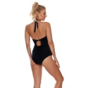 Pokud hledáte elegantní černý plavkový oblek, máme pro vás skvělý návrh. Černý plavkový oblek s odkrytými zády a ozdobnými skládáním přední části je zároveň sexy a velmi elegantní. Díky tomuto oblečení můžete vypadat krásně a výjimečně a úspěšně přitahovat pohledy ostatních. Košíčky s push-up vložkou a kosticí skvěle zdvihují a vystavují poprsí. Oblek se váže za krkem a zapíná se na zádech.