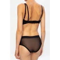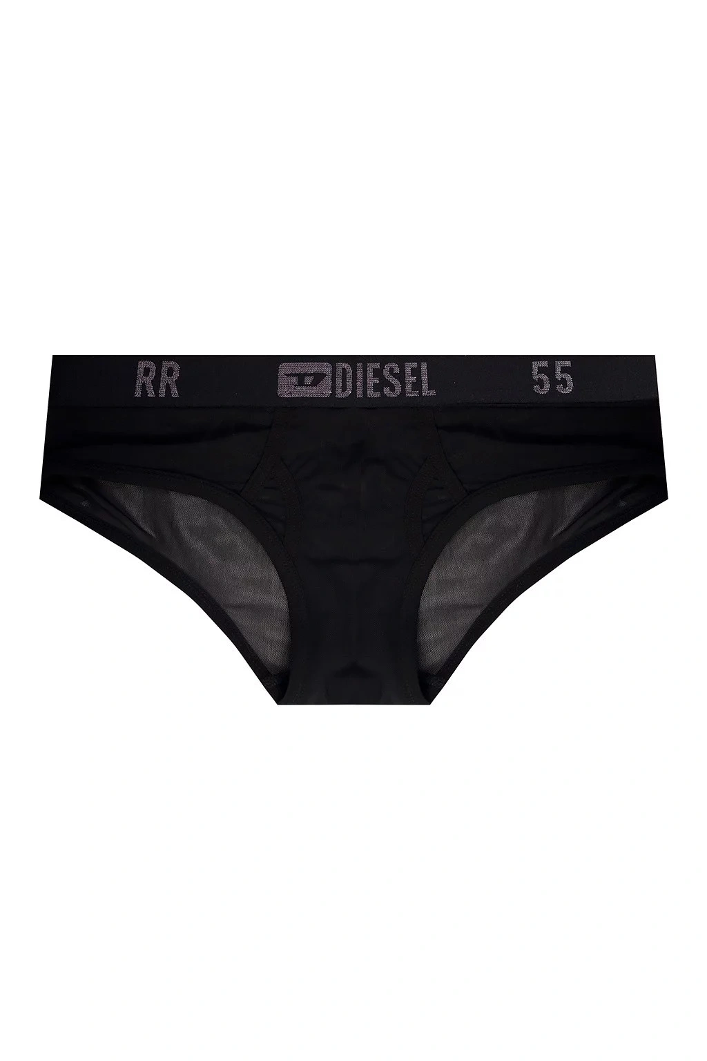Černé kalhotky od Diesel. Tento pár je vyroben z poloprůhledné síťoviny a má elastický pas zdobený logem štítku vyšívaným stříbrnou lurexovou přízí.