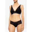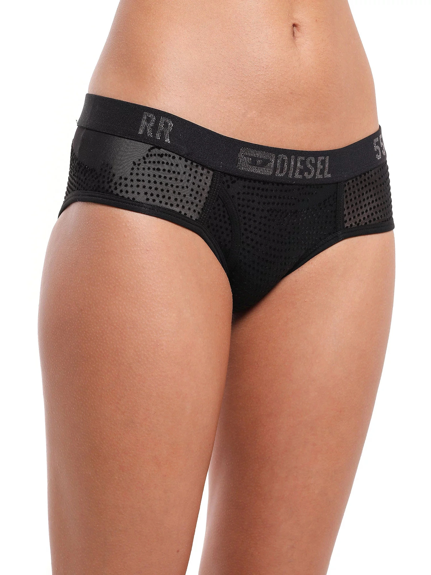 Černé kalhotky od Diesel. Tento produkt má sametový grafický vzor v černé barvě a elastický pas vykládaný stříbrnou lurexovou přízí.