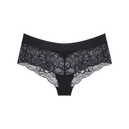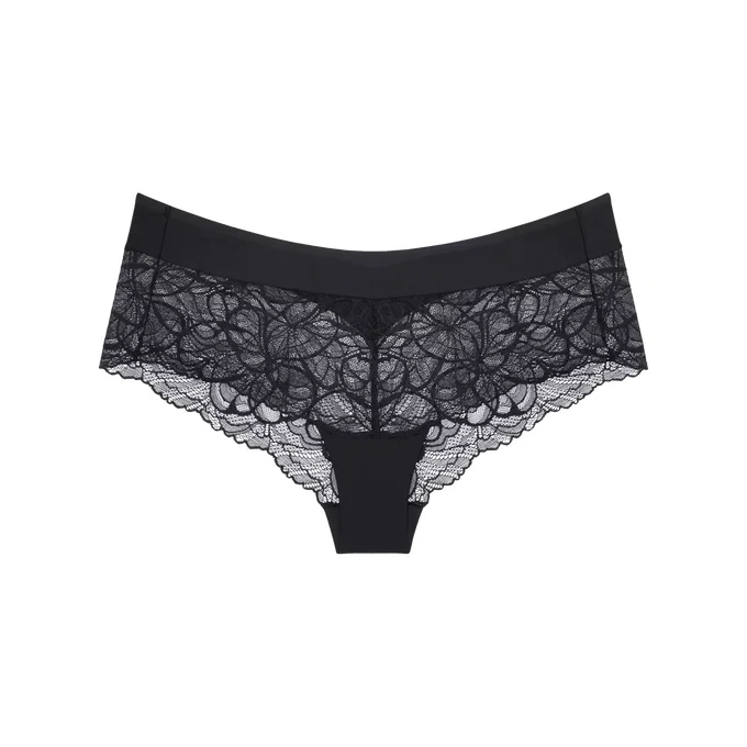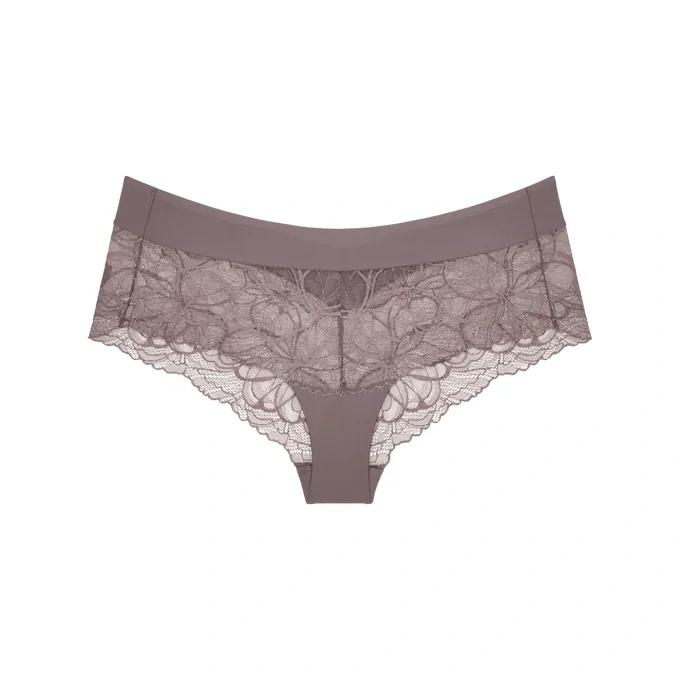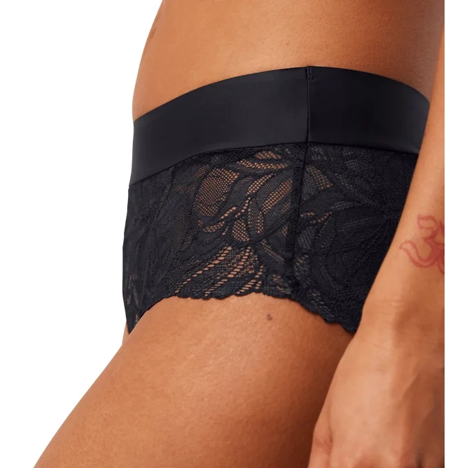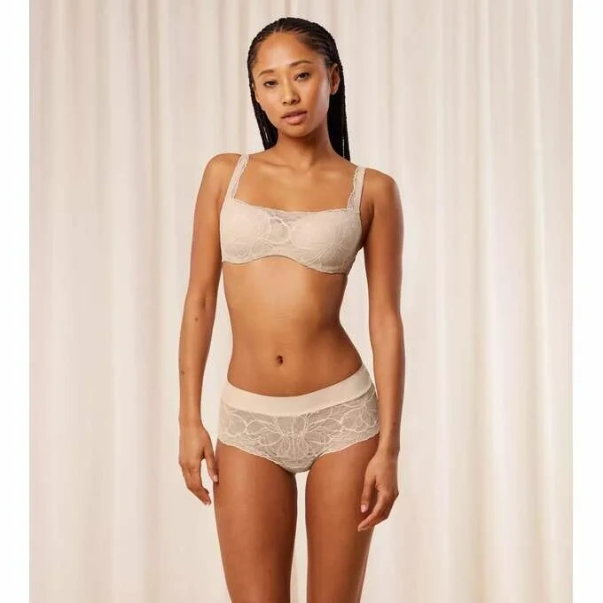 Šortky zvýšeného střihu s bezešvou technologií a hladkým elastickým pasem pro pocit druhé kůže. Spodní díl z jemné krajky a krémově hebkého mikrovlákna, částečně recyklovaného.