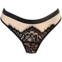 Černé krajkové kalhotky na béžovém tylu vás obklopí jemností materiálu, budete se cítit jako královna a dají průchod vašemu sex-appealu, tanga ve stylu braziliana mají vzadu zabudovanou krajku, takže se elegance prolíná s pohodlím, spolu s podprsenkou V-10771 tvoří krásný komplet, ve kterém budete nadšená.