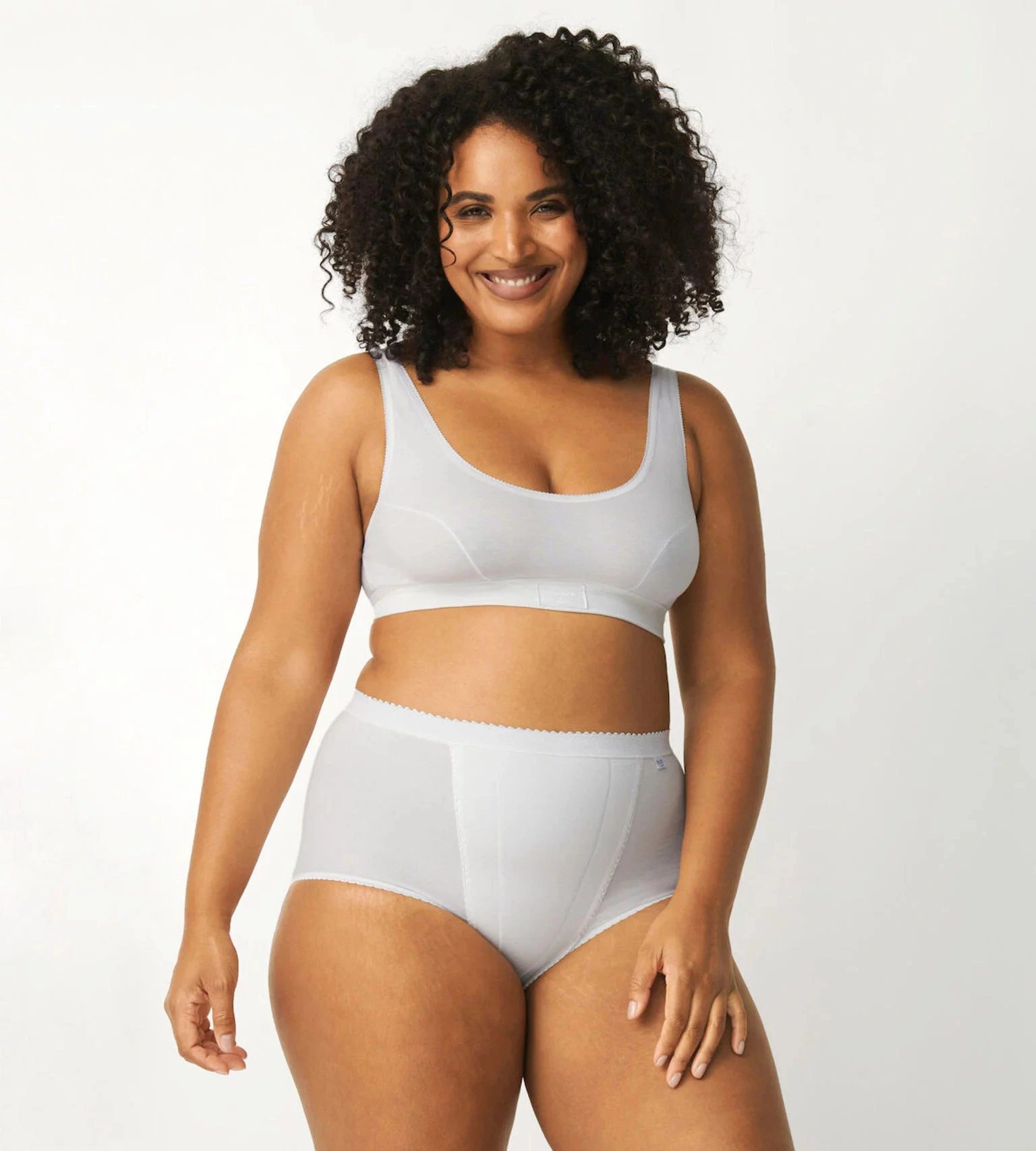 - Naše modelka má na sobě kalhotky maxi ve velikosti 38