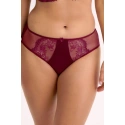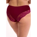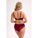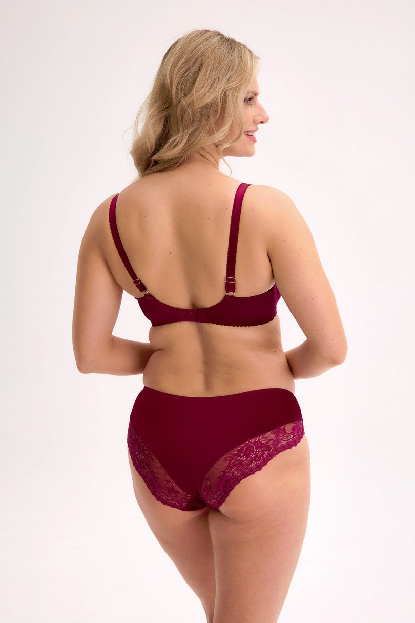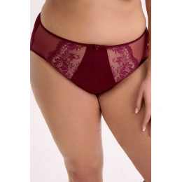 Objevte kouzlo klasické elegance v moderním pojetí s vínovými kalhotkami s jemnou krajkou. Přední část kalhotek je vyrobena z kombinace hladké látky a jemné síťoviny, zdobené květinovou výšivkou, která celku dodává ženský půvab. Zadní část kalhotek je kombinací plného zakrytí s průhlednou krajkou na bocích, která nejenže působí smyslně, ale zároveň poskytuje pohodlí po celý den. Jsou ideální pro ženy, které ocení pohodlí a krásu v jednom. Skvěle se hodí k podprsence ze stejné kolekce, čímž vytvoří elegantní komplet.