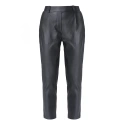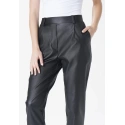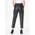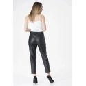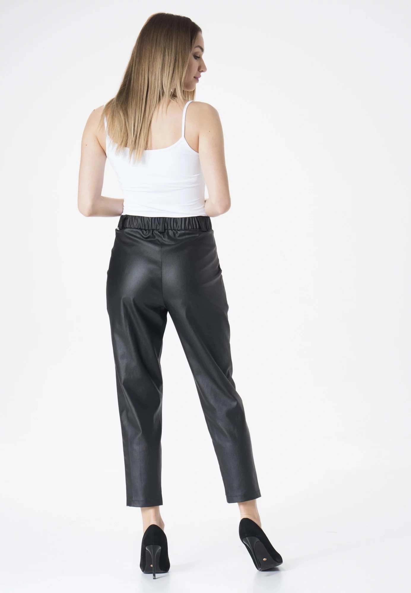 Černé kalhoty z ekokůže, vypasované, pletené. Vysoký pas. Kapsy, elastický pas s gumou v zadní části, záševky vpředu.
