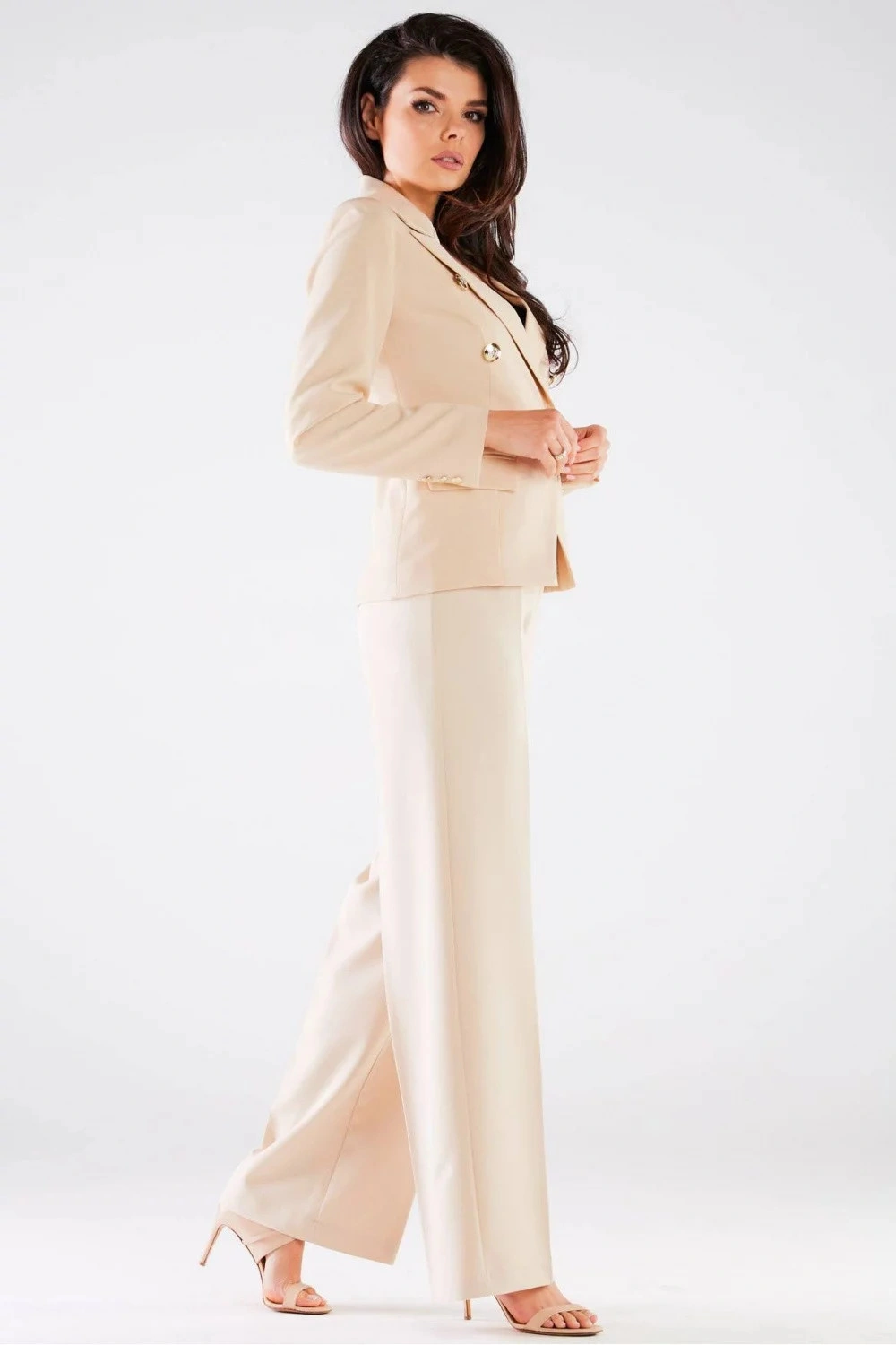 Kalhoty s vysokým sedem a širokými nohavicemi, bez kapes. Kalhoty se zipem a knoflíkem vpředu. Skvěle vypadají se sakem stejné barvy. Výrobek vyrobený v Polsku.