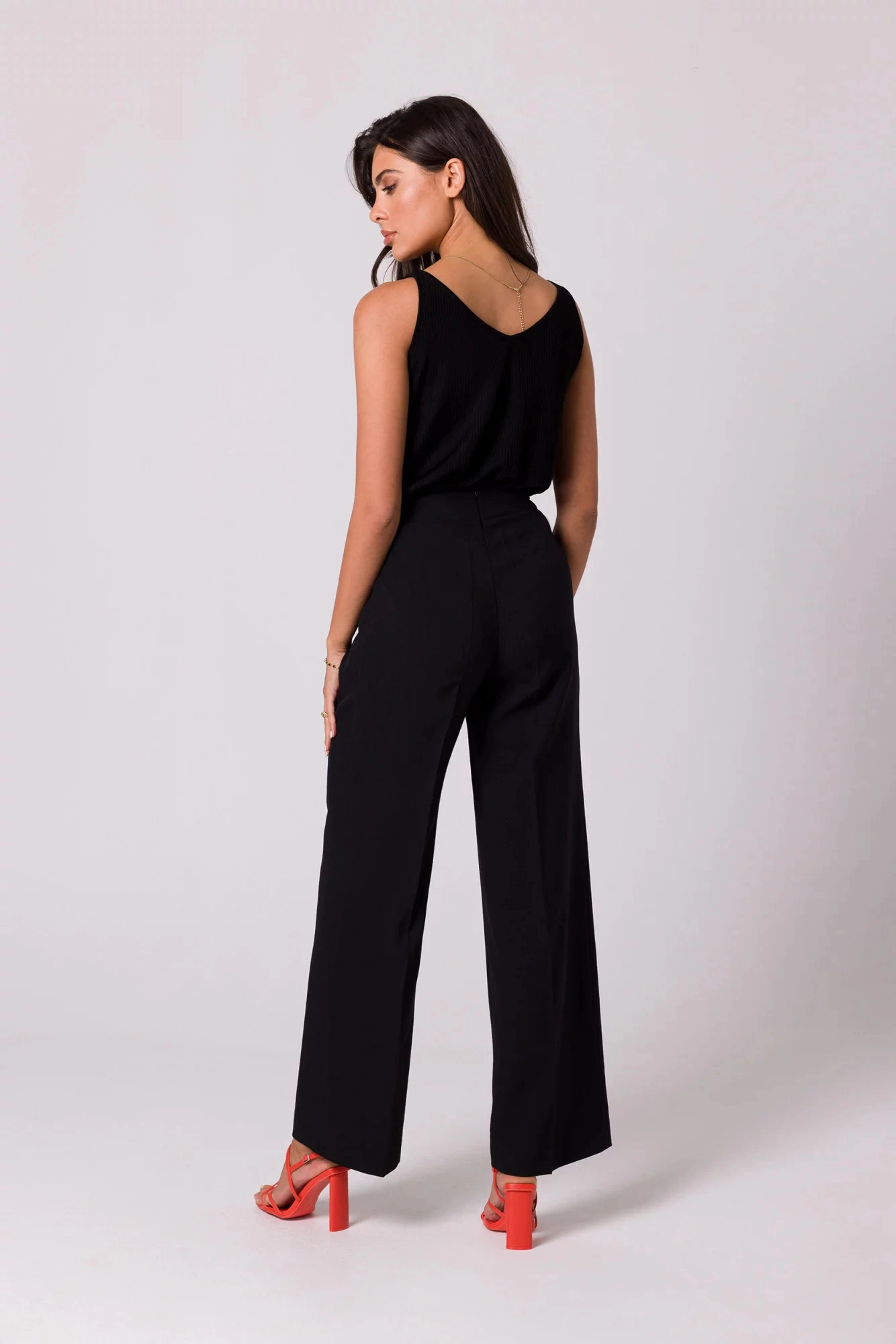 Design těchto lehkých kalhot si zamilujete - široké nohavice se záhyby, částečně elastický pas a ozdobné zlaté knoflíky vpředu.