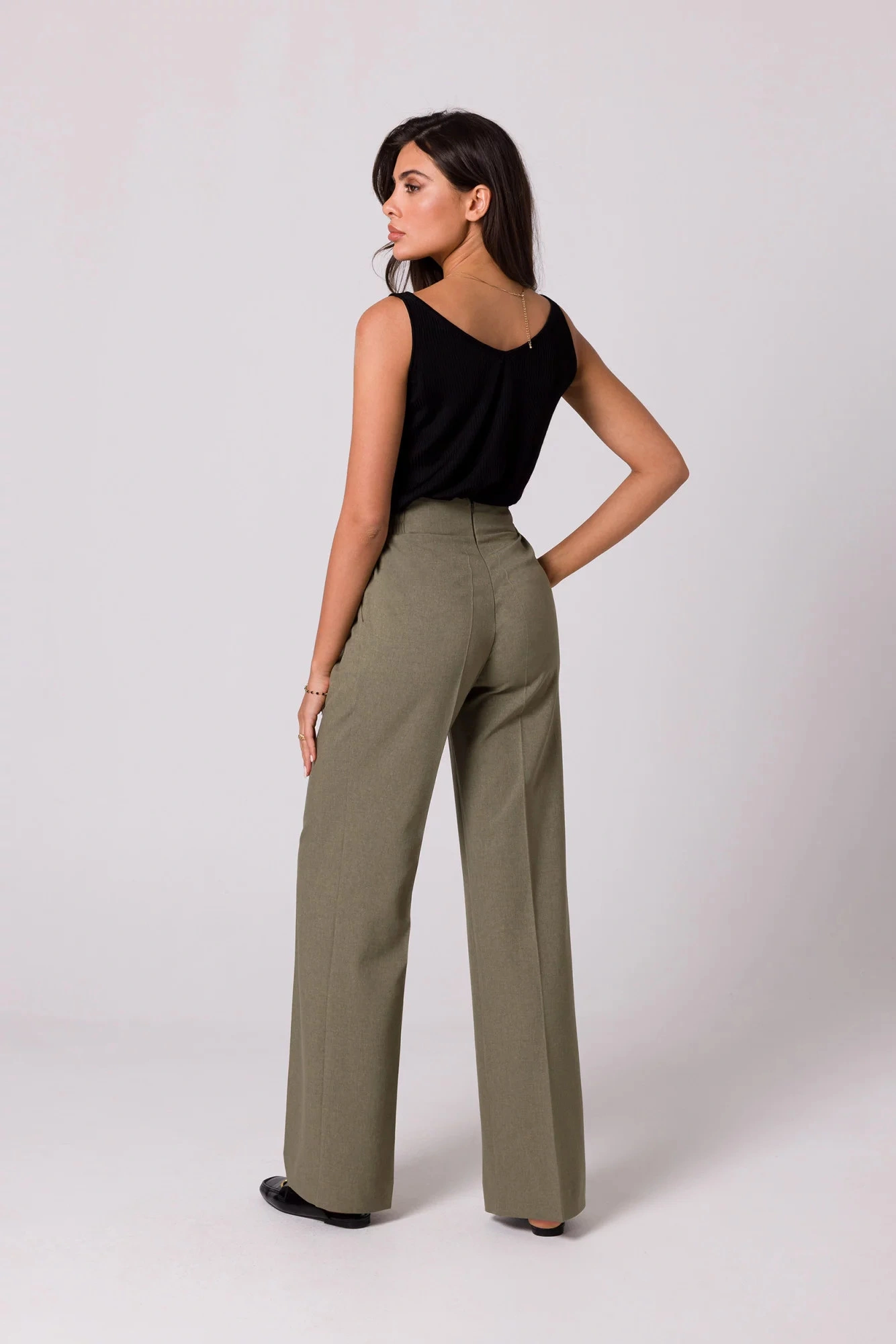 Design těchto lehkých kalhot si zamilujete - široké nohavice se záhyby, částečně elastický pas a ozdobné zlaté knoflíky vpředu.