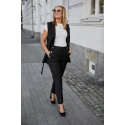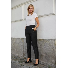 Tyto výjimečné kalhoty splní očekávání každé ženy. Jsou vyrobeny z velmi elegantní tkaniny s přídavkem elastanu. Kalhoty jsou nařasené pod úhlem, na přední straně mají ozdobné knoflíky, na zadní straně jsou vykrojené kapsy a v pase je pružný pásek. Kalhoty s vysokým pasem.