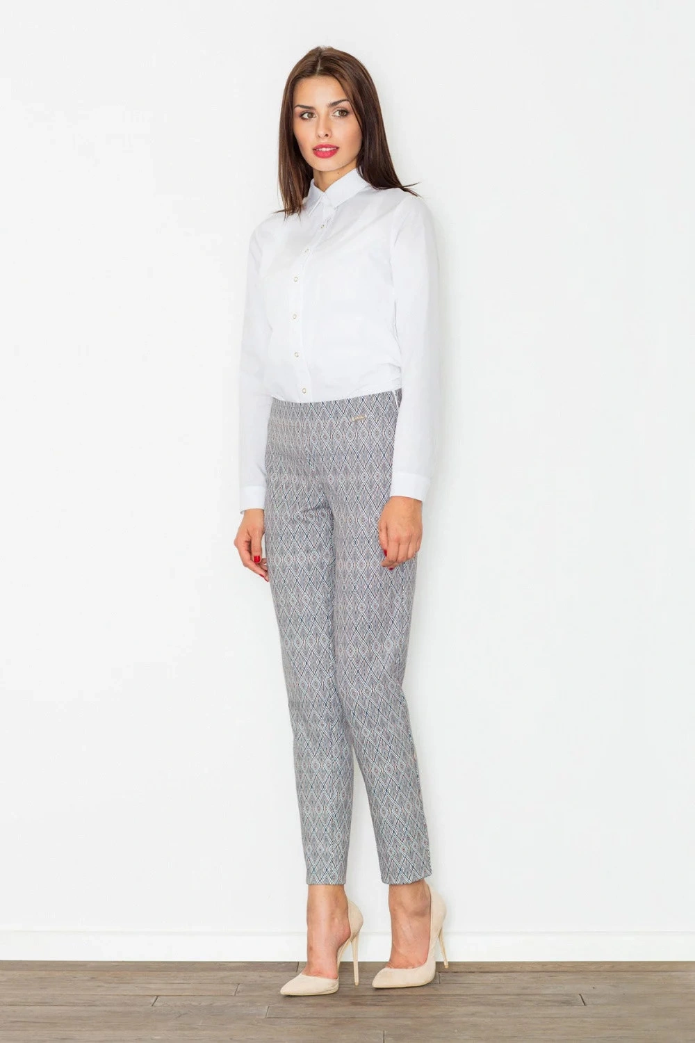 Elegantní kalhoty s vysokým pasem a barevnými a zajímavými potisky. Kalhoty se zipem na boku. Kalhoty nemají kapsy.