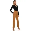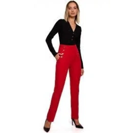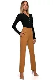 Kalhoty s úzkým pasem, vysokým sedem a ozdobnými patentkami na kapsách. Kalhoty se skrytým zipem.