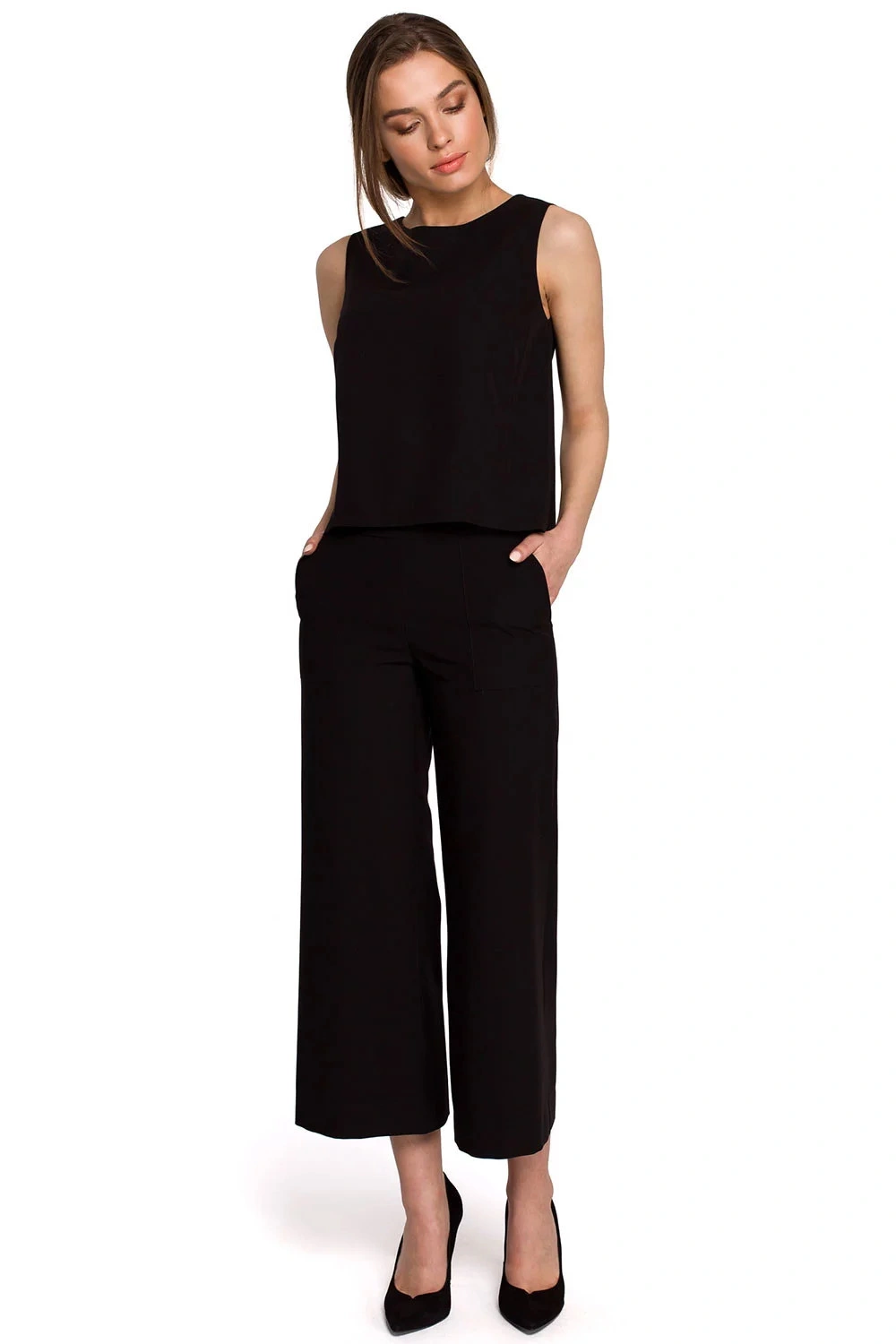 Kalhoty s úzkým pasem, vysokým sedem a ozdobnými patentkami na kapsách. Kalhoty se skrytým zipem. El