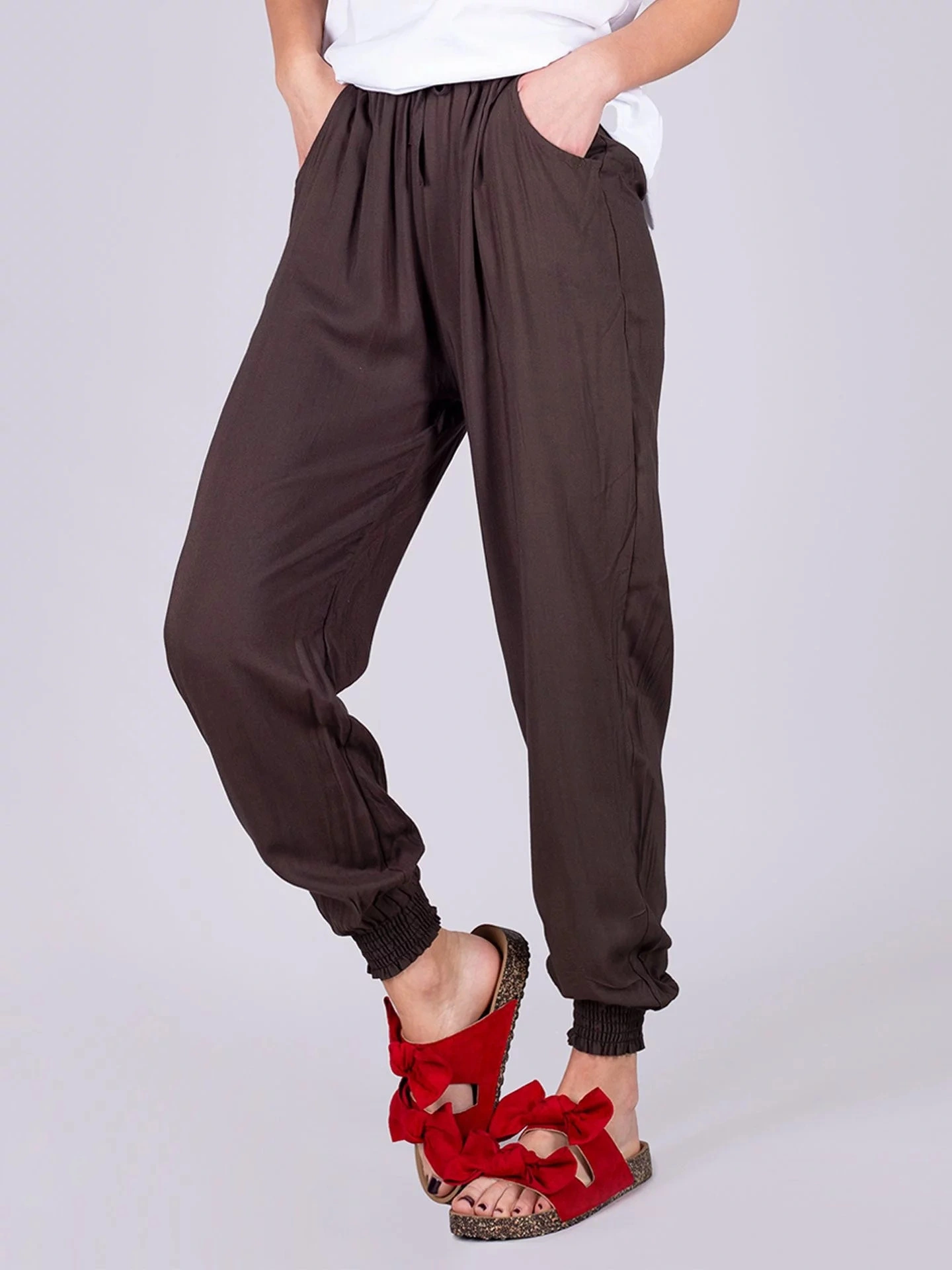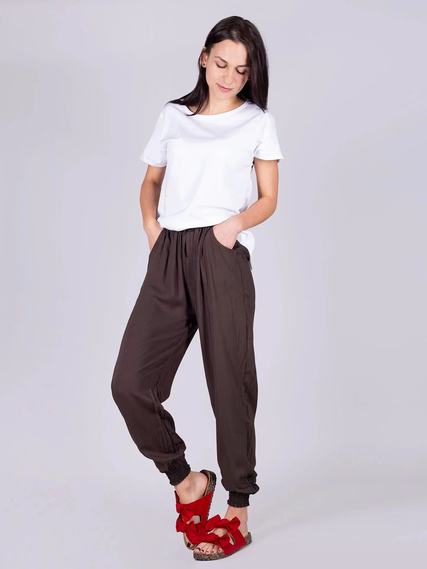 Dámské letní kalhoty v khaki barvě. Mají dvě praktické boční kapsy. Je vyrobena z jemné a lehké viskózy, která je ideální pro teplé dny. Díky stahovací šňůrce v pase si je můžete přizpůsobit svým individuálním potřebám a šňůrka má ozdobnou funkci. Spodní část nohavic zakončená širokými švy jim dodává ležérní vzhled.