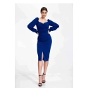 Midi koktejlové šaty z elastické látky s dlouhými bufetovými rukávy zakončenými nerozpáranou manžetou. Stahovací výstřih. Ozdobné řasení vpředu a vzadu po celé délce šatů. Jemný rozparek ve spodní části předního dílu. Šaty bez podšívky a bez zapínání.