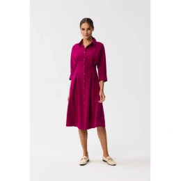 PODROBNOSTI O PRODUKTU: tkaná látka šaty s límečkem na knoflíky rozšířený design s kosticemi v pase 3/4 rukávy s manžetami délka pod kolena bez podšívky naše modelka je vysoká 174 cm a nosí velikost S navrženo a vyrobeno v Polsku