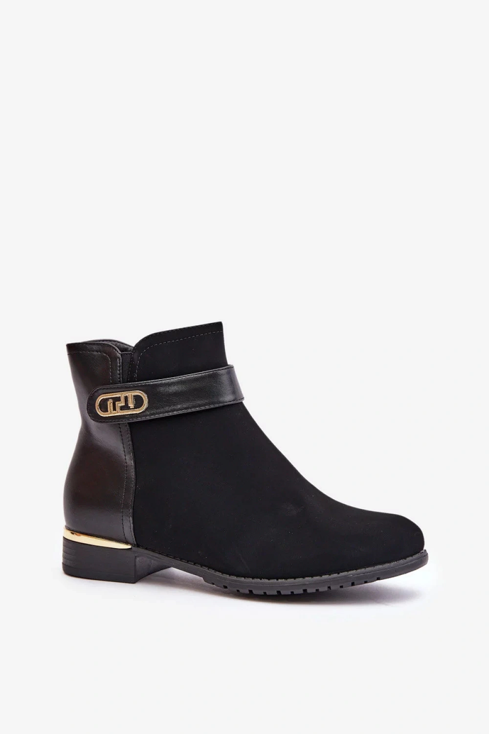 Nízké boty z ekologické kůže. Ideální pro chladnější dny díky zateplení boty dekou. Jsou usazeny na plochém podpatku a poskytují pohodlí při nošení. Na svršku je pásek se zlatým detailem, který dodává eleganci. Boty, které musíte mít!